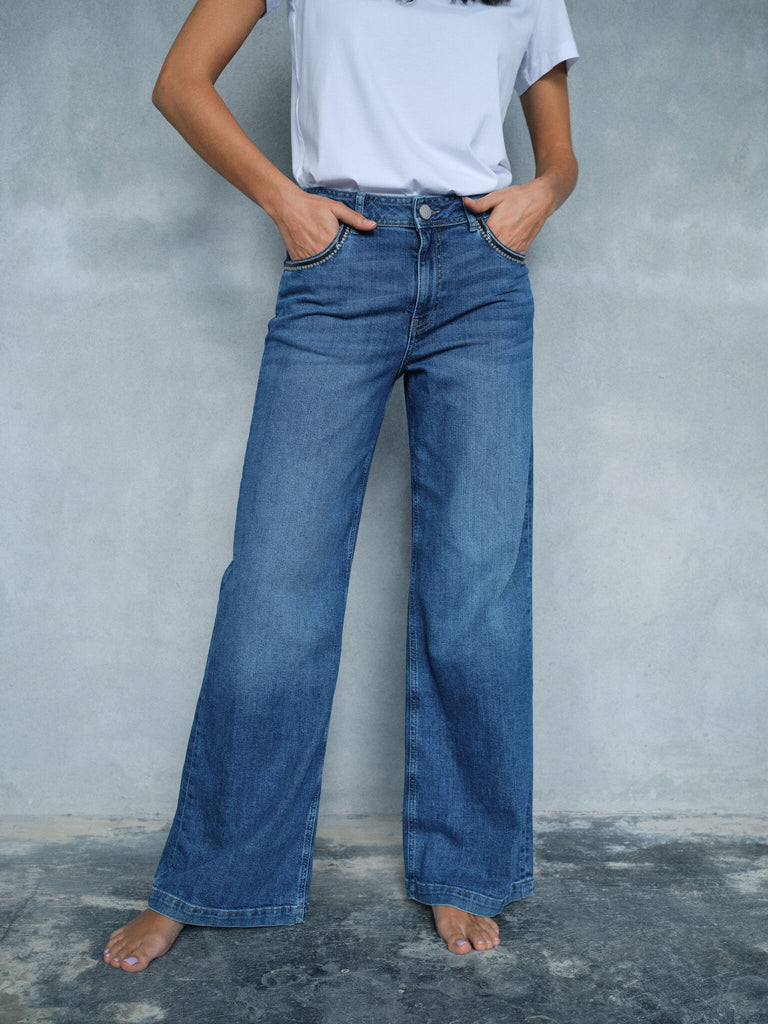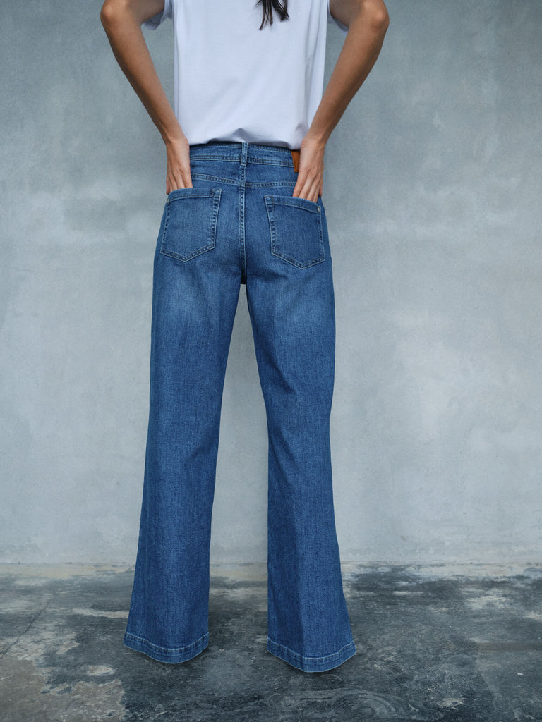 Jeans med brede ben er perfekte for kvinner som elsker en retro culotte-passform eller en boksy silhuett. Denne passformen er bredere på knærne og nederst, og gir en løsere, avslappet passform som er både kul og komfortabel. Med sin culotte-lignende form skaper jeans med brede ben en illusjon av lengre ben og fremhever midjen subtilt, noe som gjør dem til et flatterende valg for de fleste kroppstyper.