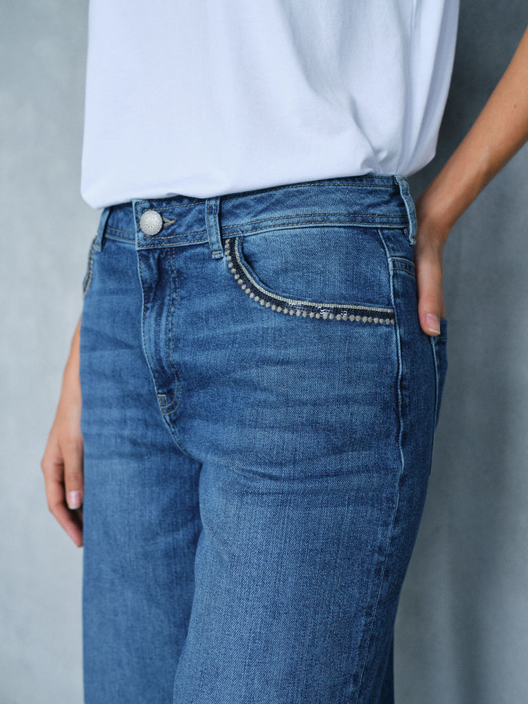 Regular fit-jeans har en avslappet estetikk med en avsmalnet passform rundt beina, noe som gir god støtte samtidig som den sikrer en komfortabel passform uten å være for stram rundt lårene. Disse jeansene sitter komfortabelt rundt hofter og lår, og smalner av ved anklene for å skape en balansert form som passer alle kroppstyper, spesielt de med en mer kurvete silhuett. De er ofte utsmykket med et snev av dekorativ glamour for å gi ekstra stil til antrekket.