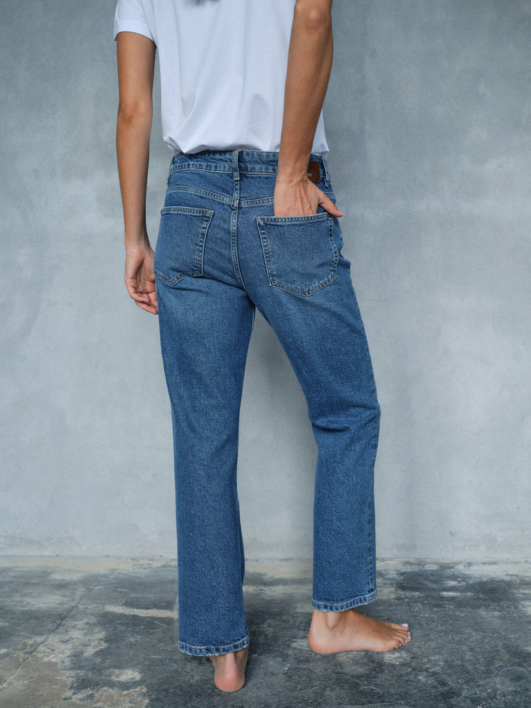 Straight fit-jeans er designet med rette ben som holder samme bredde fra hoftene og ned til kanten. Denne konsistente bredden skaper et slankt, balansert utseende som smigrer alle kroppstyper. Uansett kroppsfasong har straight jeans en slankende effekt som fremhever de naturlige linjene i beina dine uten å være for stramme eller for løse.