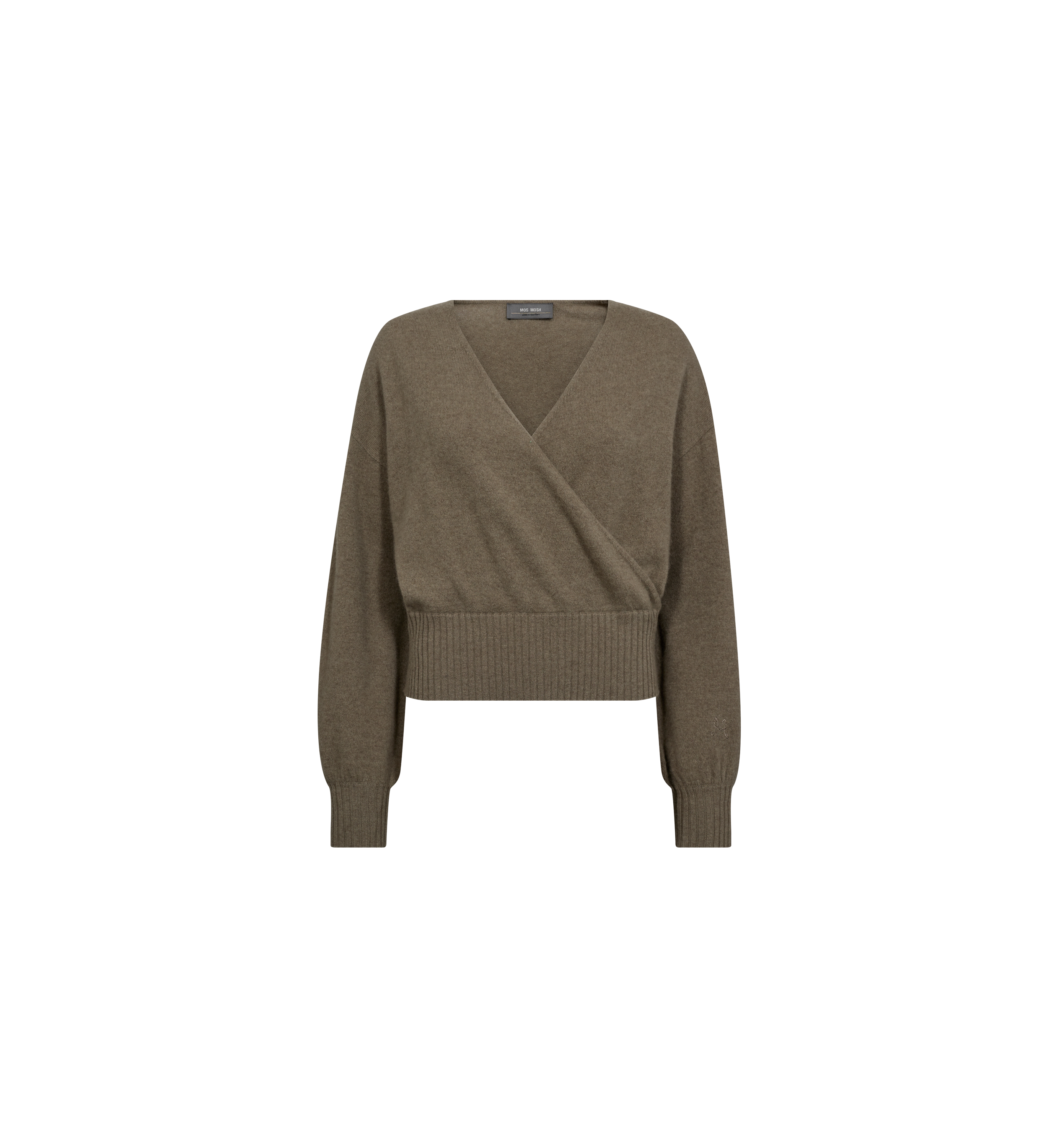 Denne sofistikerte omslagsstrikken, laget av en luksuriøs kasjmirblanding, tilbyr både komfort og tidløs eleganse. Den har en flatterende V-hals og en vanlig silhuett, designet med ribbestrikkede detaljer ved ermene og kanten for et polert preg. Diskret prydet med et MOS MOSH-logo på venstre erme, er denne allsidige strikken perfekt for enkel lag-på-lag styling og raffinert utseende.
