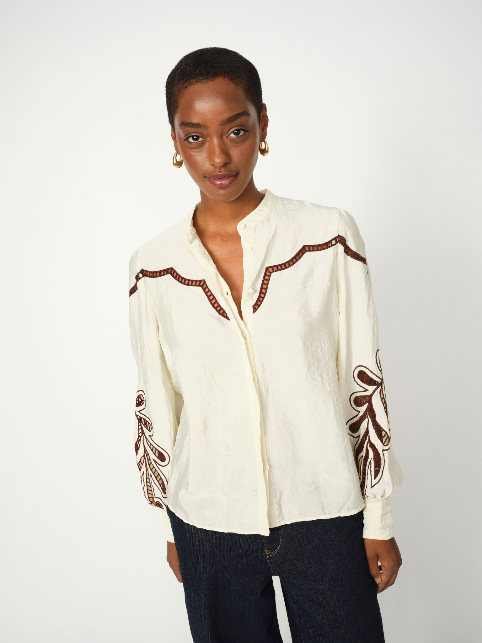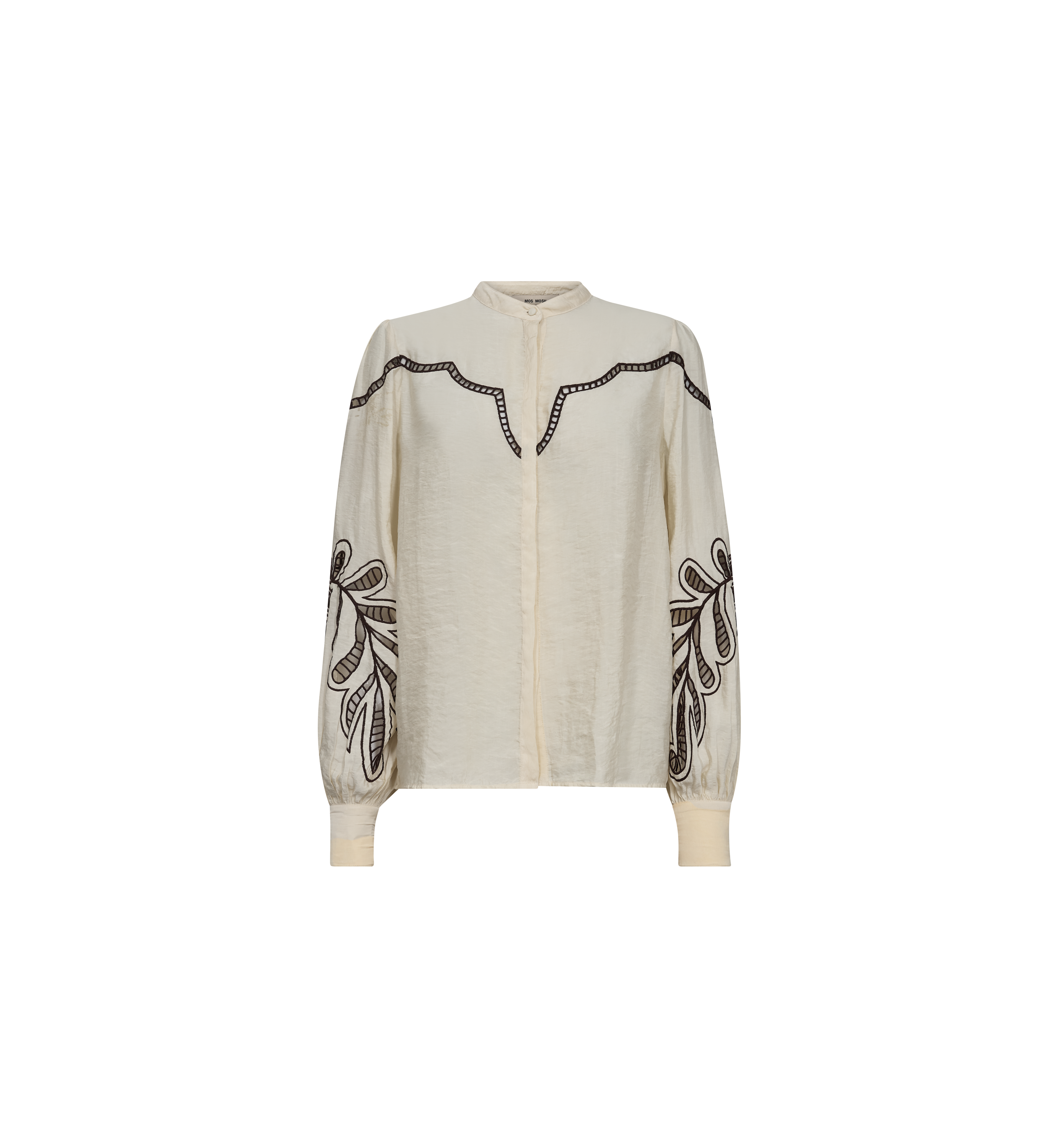 Denne elegante skjorten er laget i en vanlig passform, og har en sofistikert ståkrage samt en skjult knappestolpe for et rent og polert utseende. Den slående kontrastbroderingen tilfører et unikt og raffinert preg, noe som gjør den til et virkelig blikkfang i garderoben. Med knappede mansjetter kan den enkelt styles med skreddersydde bukser eller denim for et stilfullt og allsidig antrekk.