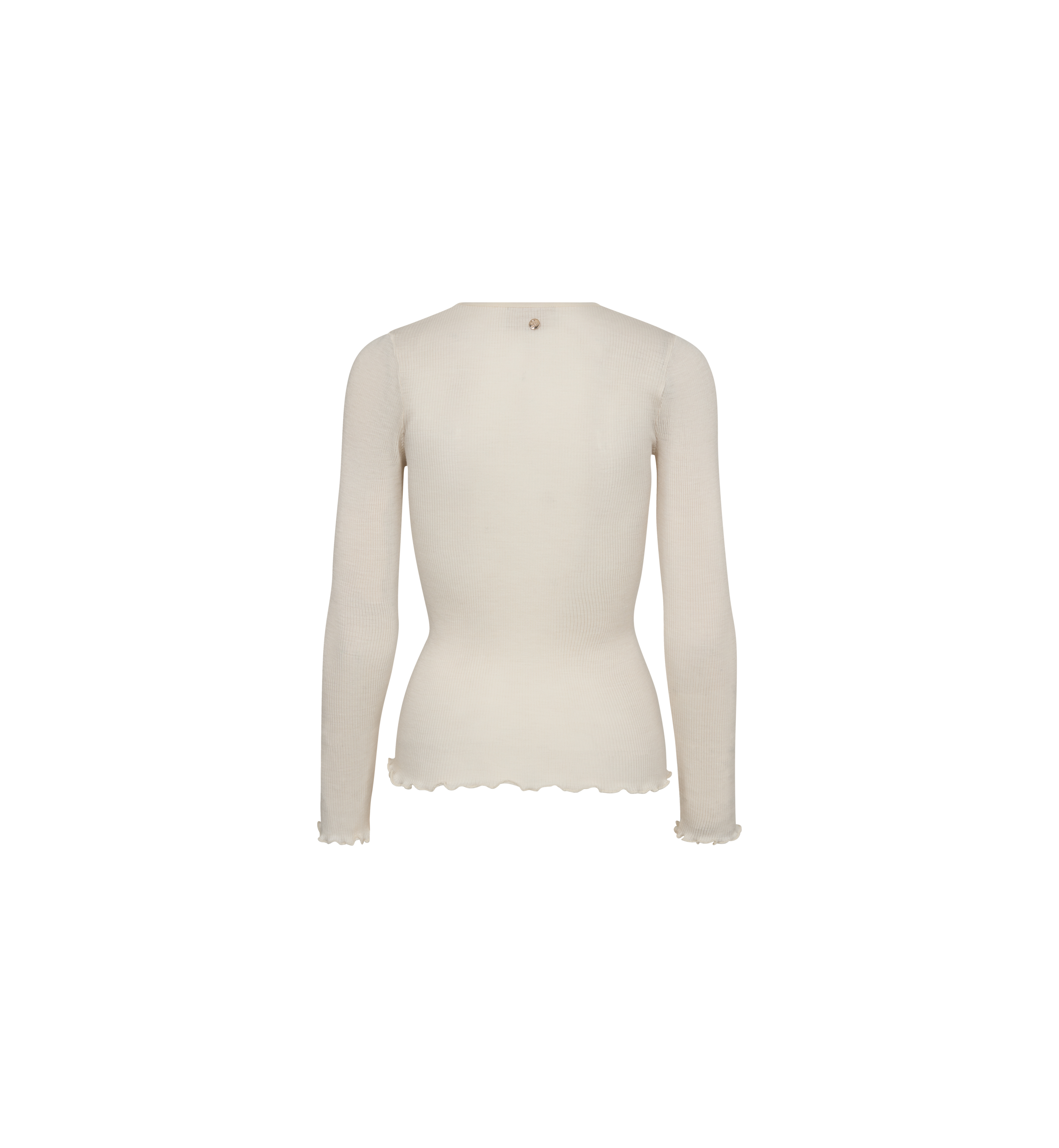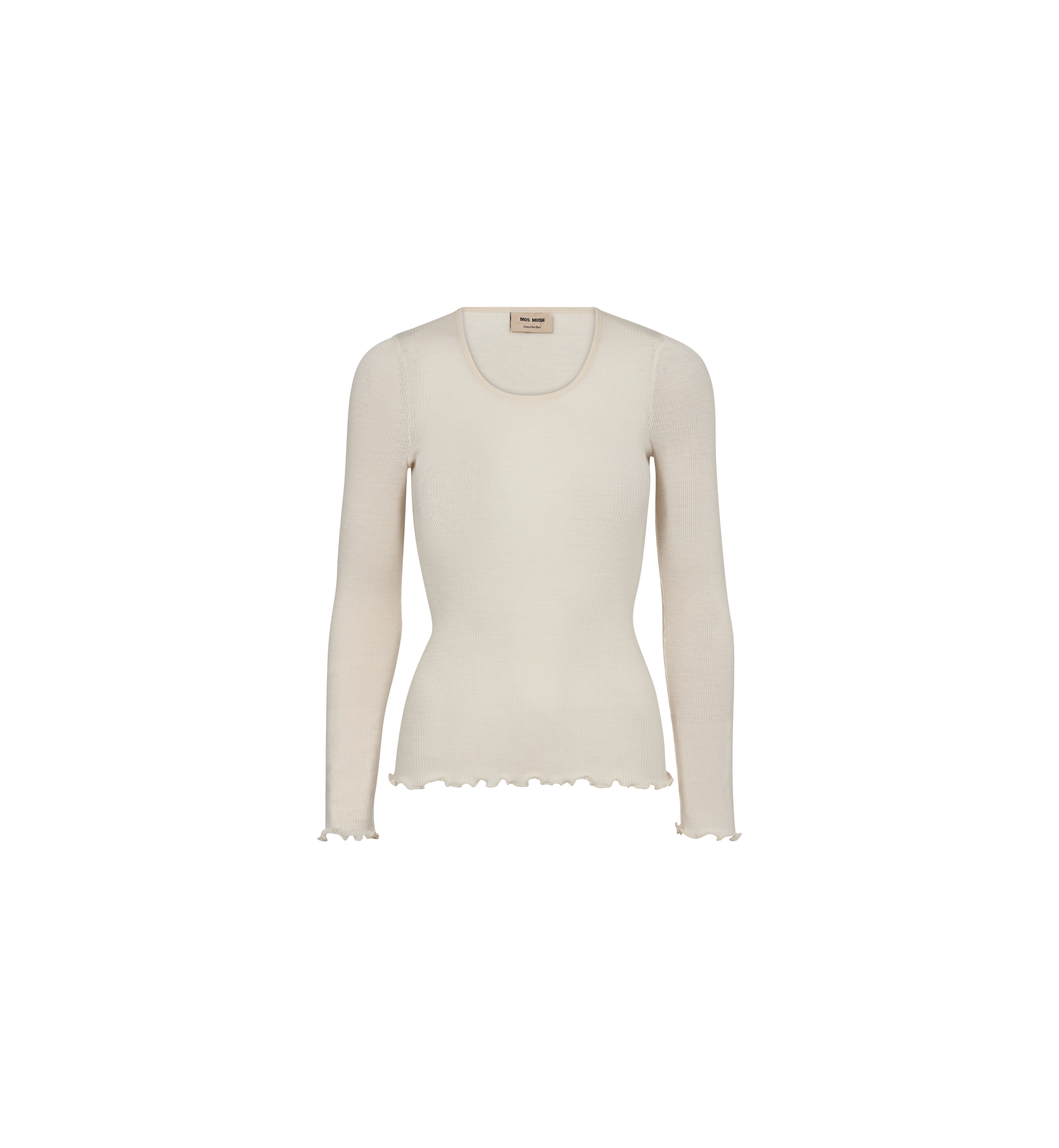 Møt den perfekte t-skjorten: laget av ull og modal for en myk og behagelig følelse mot huden. Den tettsittende, ribbestrikkede designen har volangkant på ermer og nederst, som gir et unikt og feminint uttrykk. Allsidig nok til å styles både med dressbukser og denim – et uunnværlig plagg i garderoben.