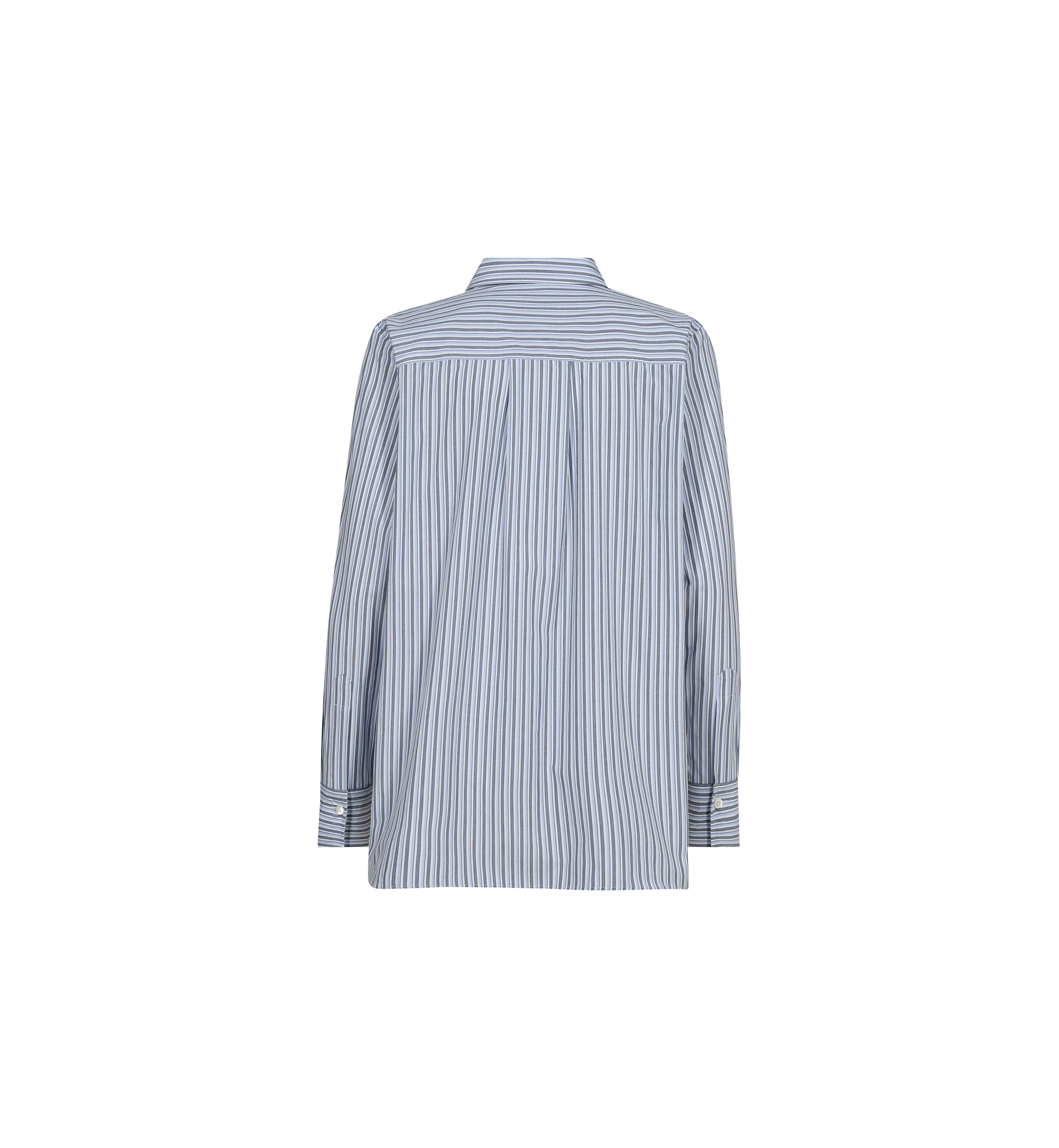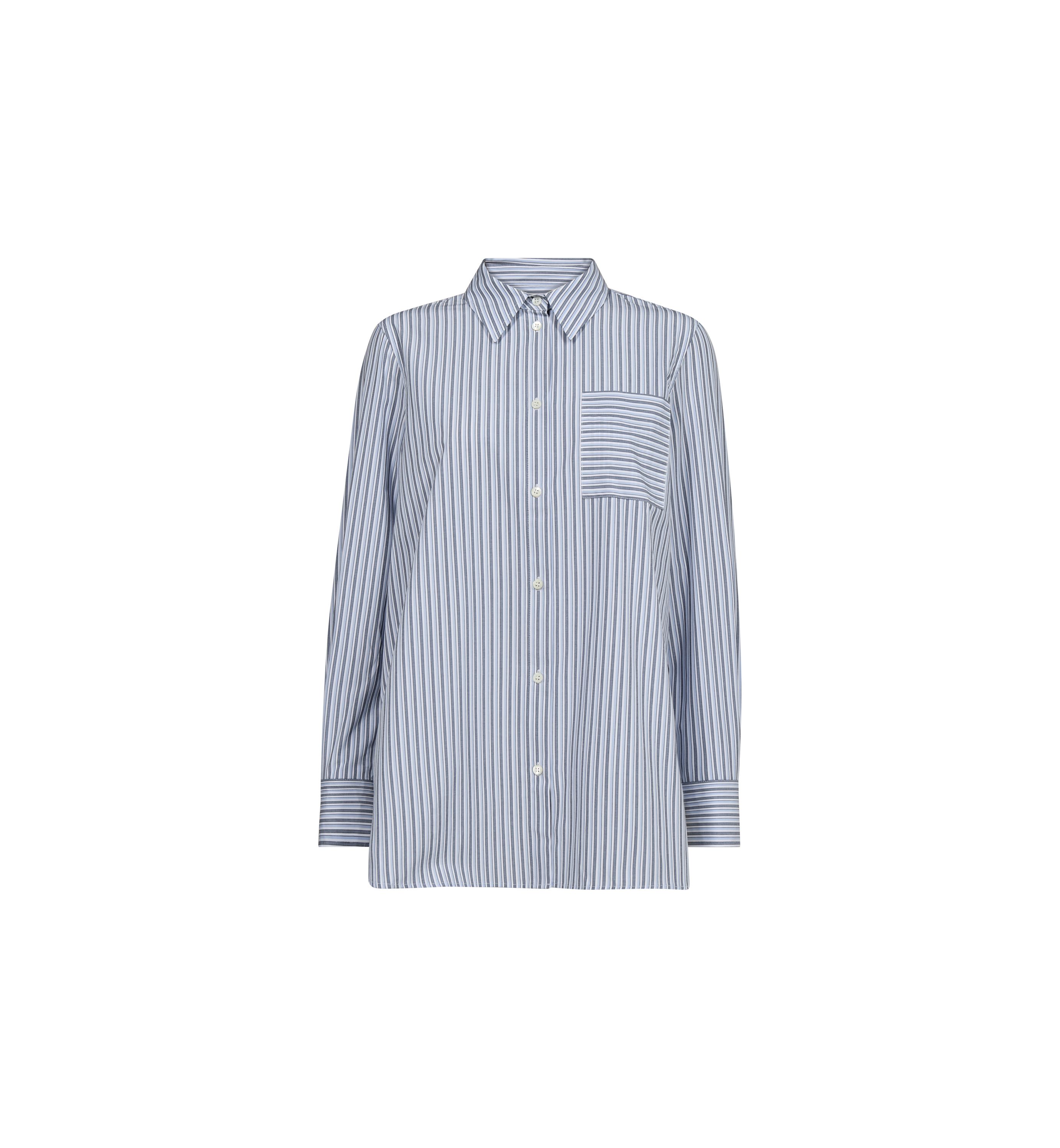 Denne tidløse stripete skjorten er designet med en avslappet passform, som kombinerer uanstrengt komfort med raffinert eleganse. Den har en klassisk krage, knappelukking og en stilren brystlomme, som gir et moderne preg til en garderobeklassiker. Kombiner den med skreddersydde bukser for et hevet utseende, eller style den med denim for et uanstrengt, chic hverdagsantrekk.