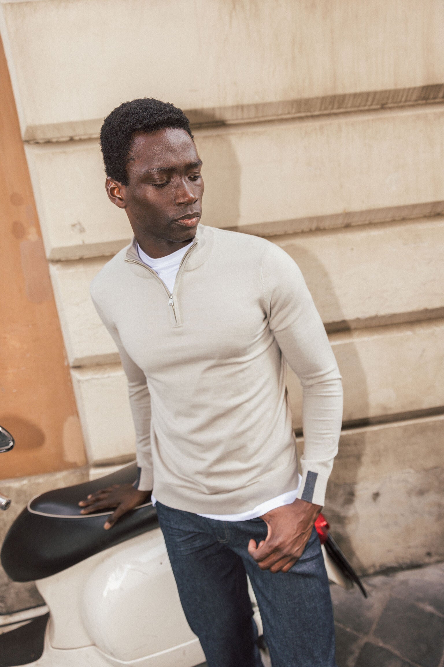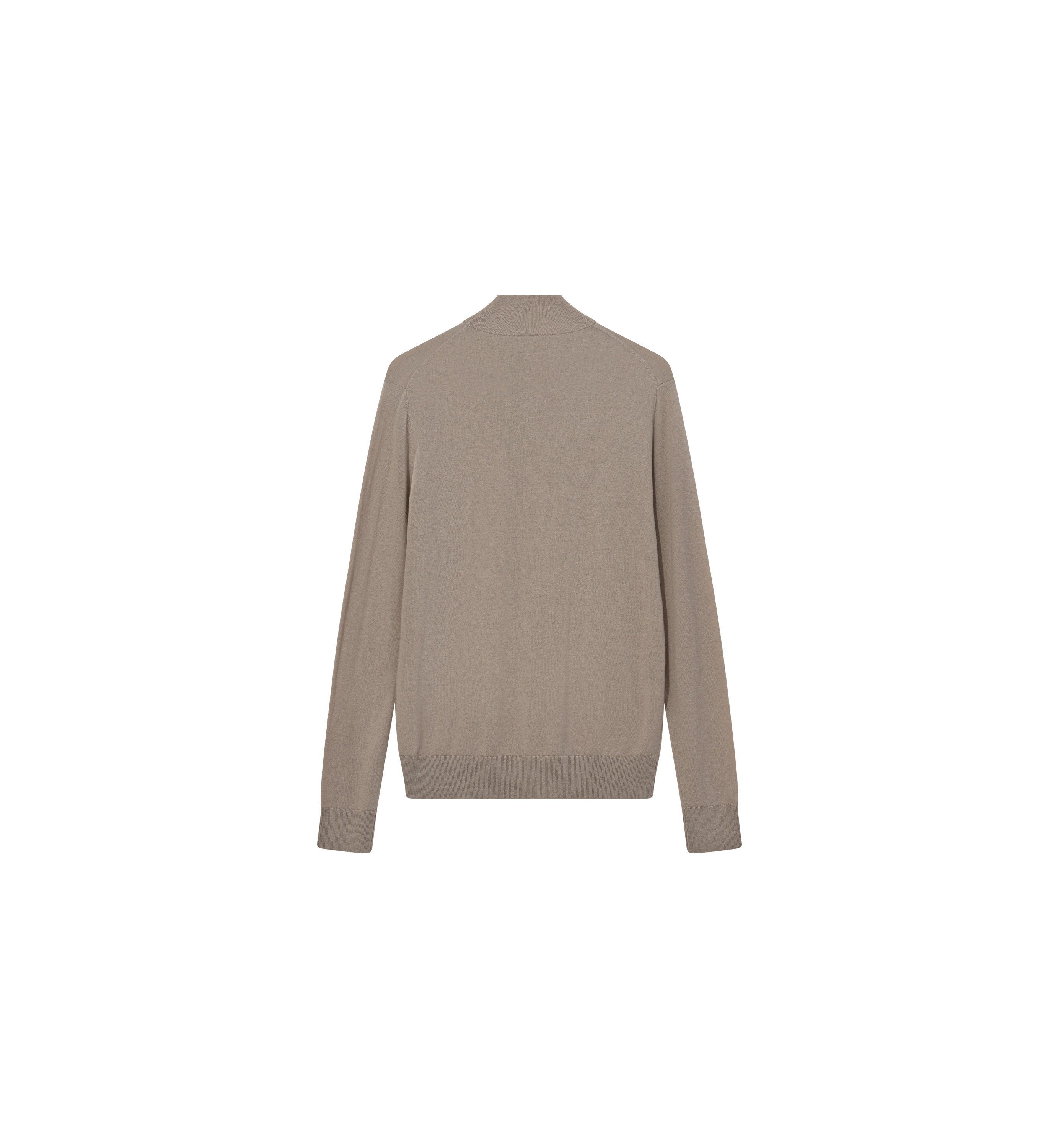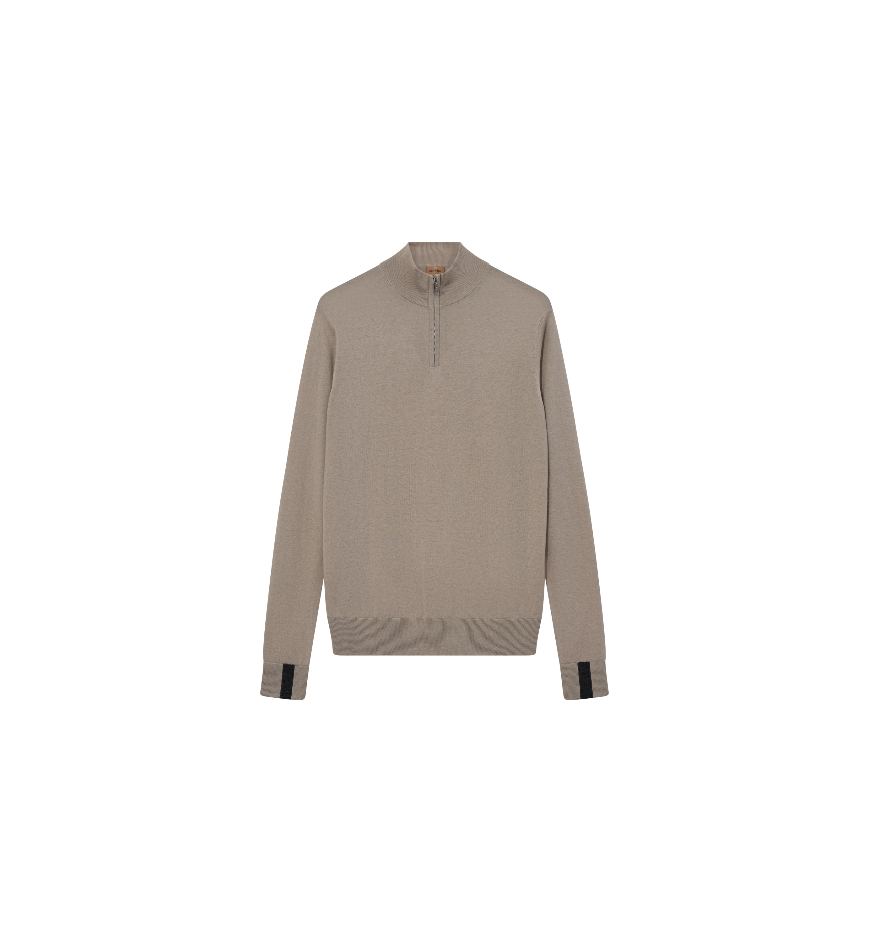 Regelmessig passform strikket genser, laget av en myk blanding av silke og ull. Har høy krage med glidelås, ribbestrikkede kanter og kontraststriper ved ermene. Ideell for lag-på-lag styling med denim på denim.