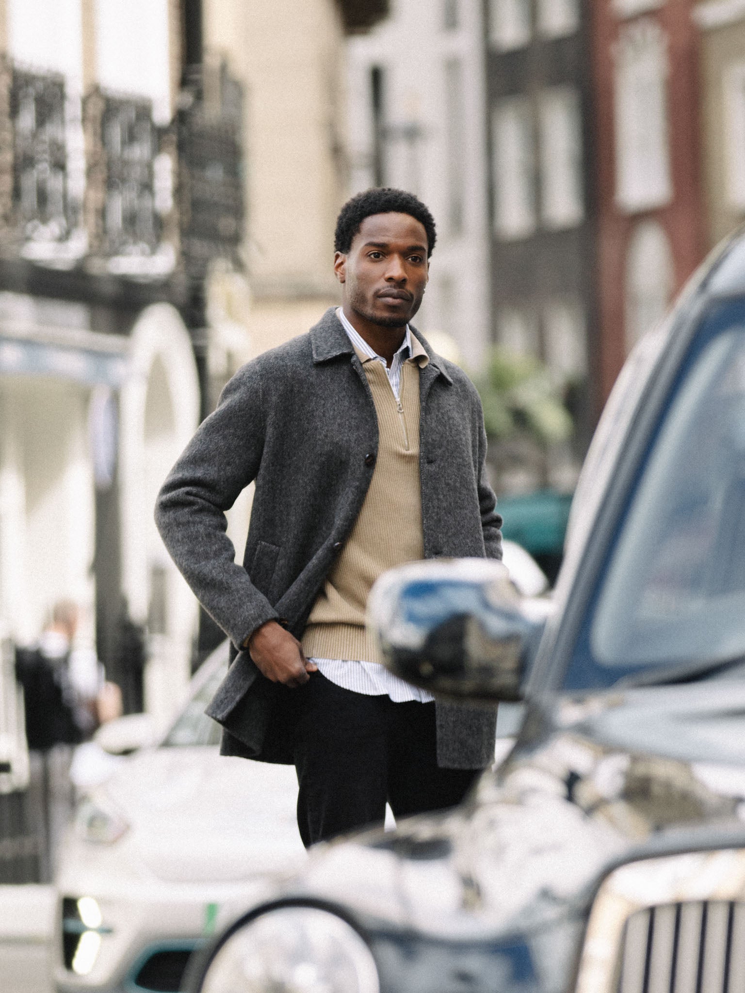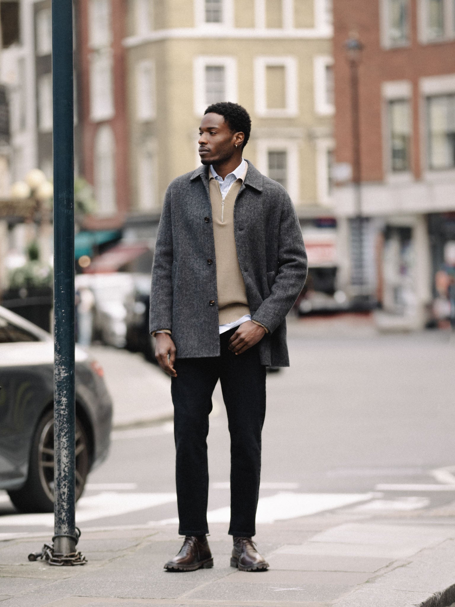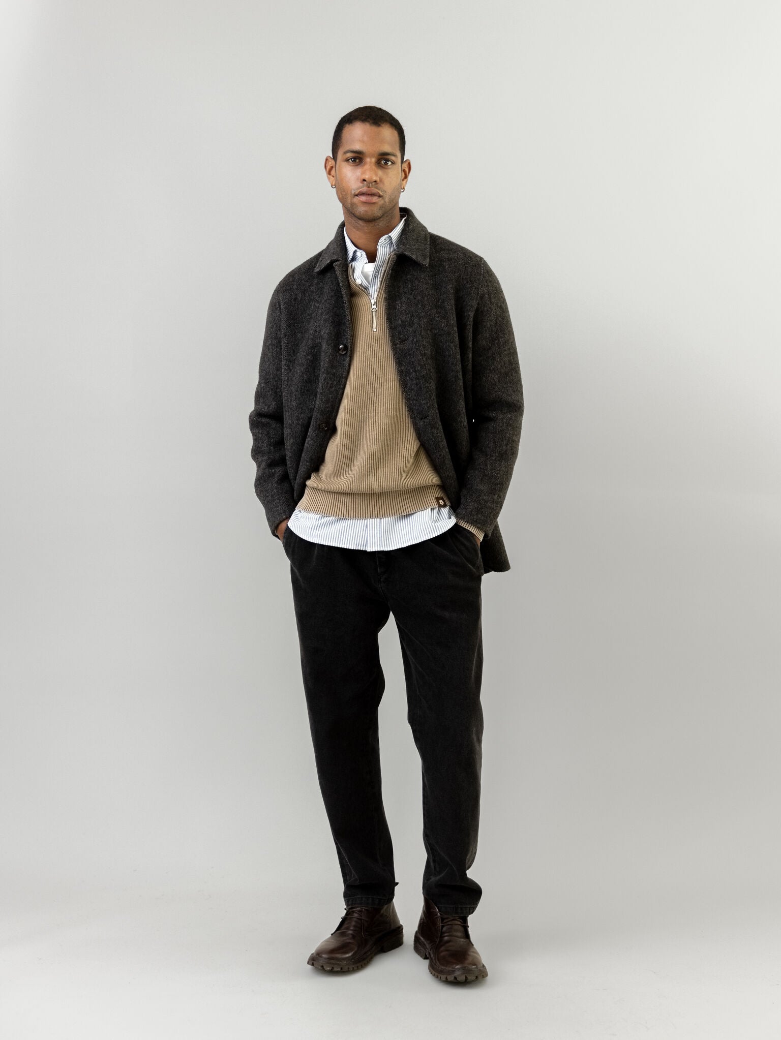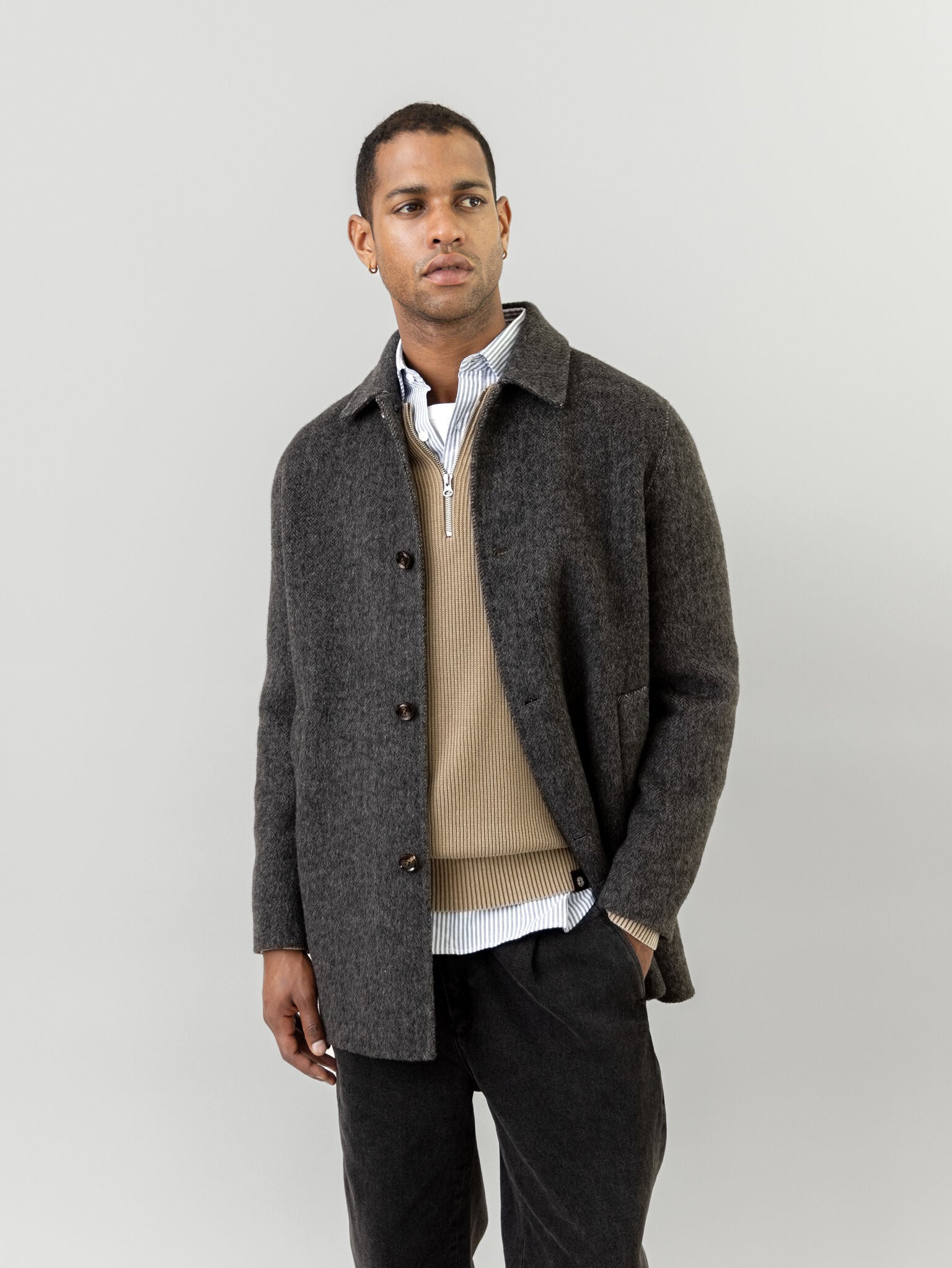 Skreddersydd i herringbone ull, denne uforede kåpen gir en raffinert silhuett med en lett, svevende følelse. Den er designet med en vanlig passform, knappelukking og funksjonelle lommer – perfekt for lag-på-lag uten å bli tung. Et tidløst ytterplagg som enkelt utstråler en subtil sofistikert stil.