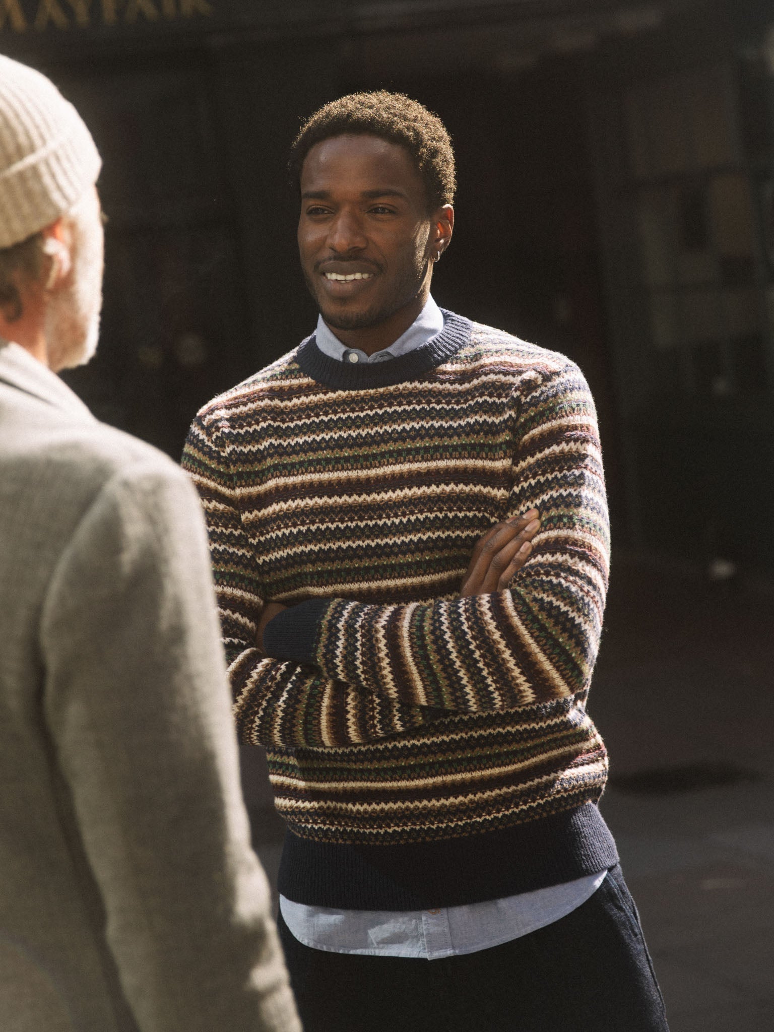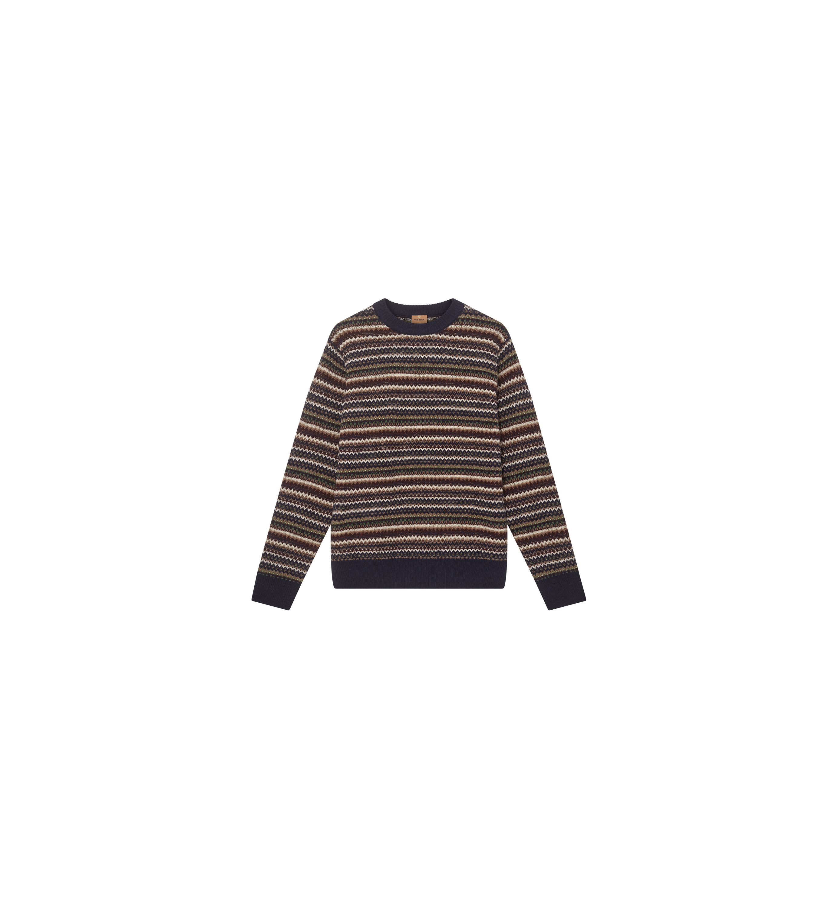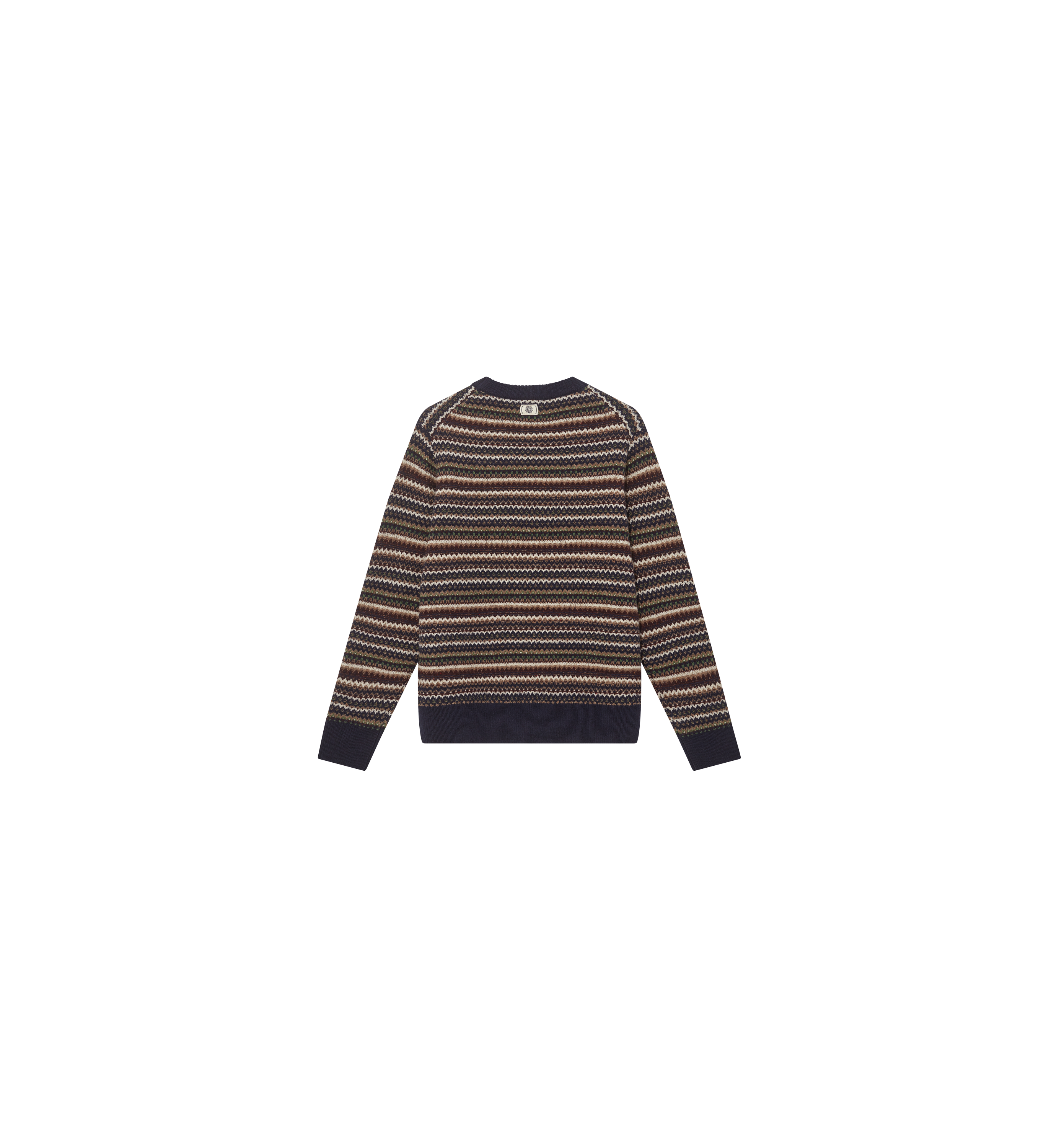 Denne jacquardstrikkede genseren skiller seg ut med sitt flerfargede stripe-mønster og chunky silhuett. Laget av en blanding av ull og bomull, har den ribbestrikkede kanter og et diskret logo på baksiden. Modig, men samtidig lett å bruke, er den et umiddelbart blikkfang for kjøligere dager.