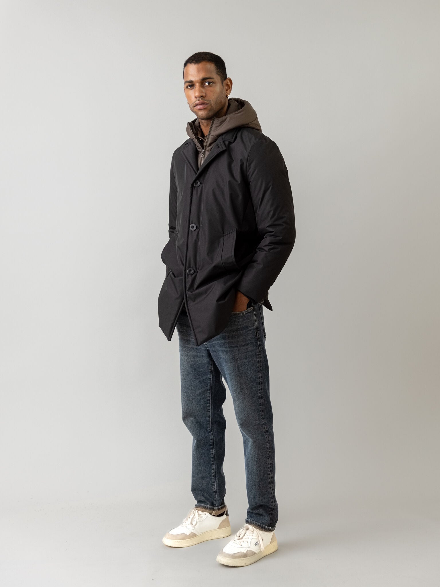 En moderne ytterjakke som er et must-have med en sporty vri, laget i en vanlig passform og med en litt lengre silhuett for ekstra dekning. Den er designet med funksjonelle detaljer som stormmansjetter, sidelommer og en avtagbar hette i kontrastfarge, noe som gjør den perfekt for skiftende værforhold. Style den enkelt over en overskjorte og hettegenser for et stilig, lag-på-lag utseende sammen med chinos.