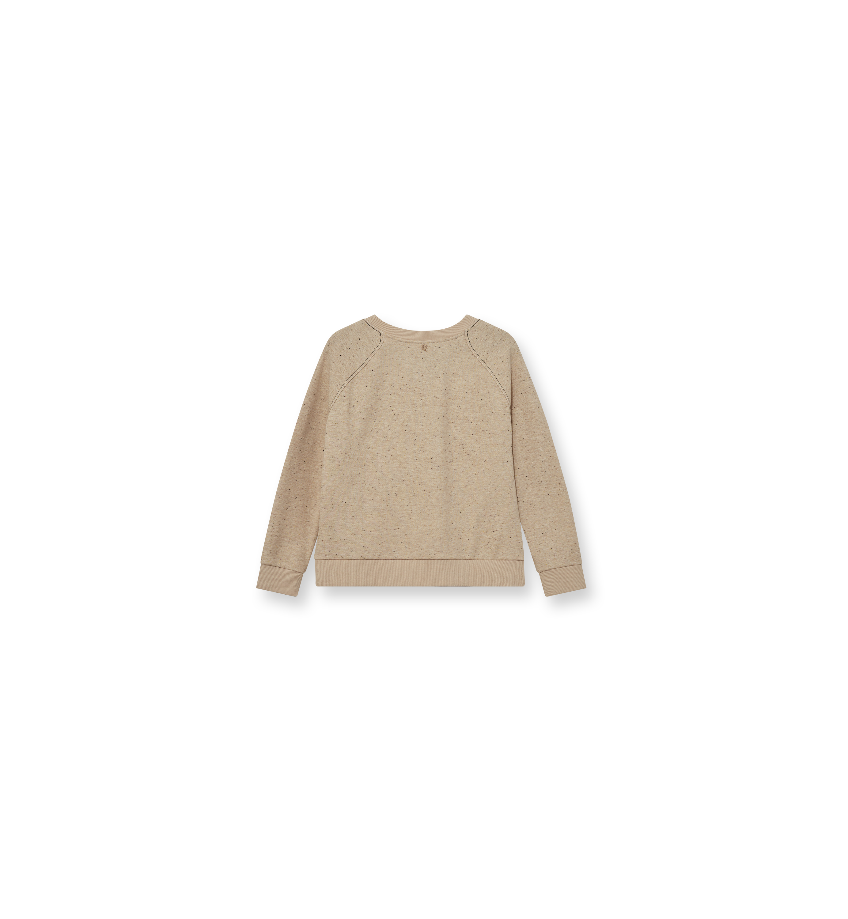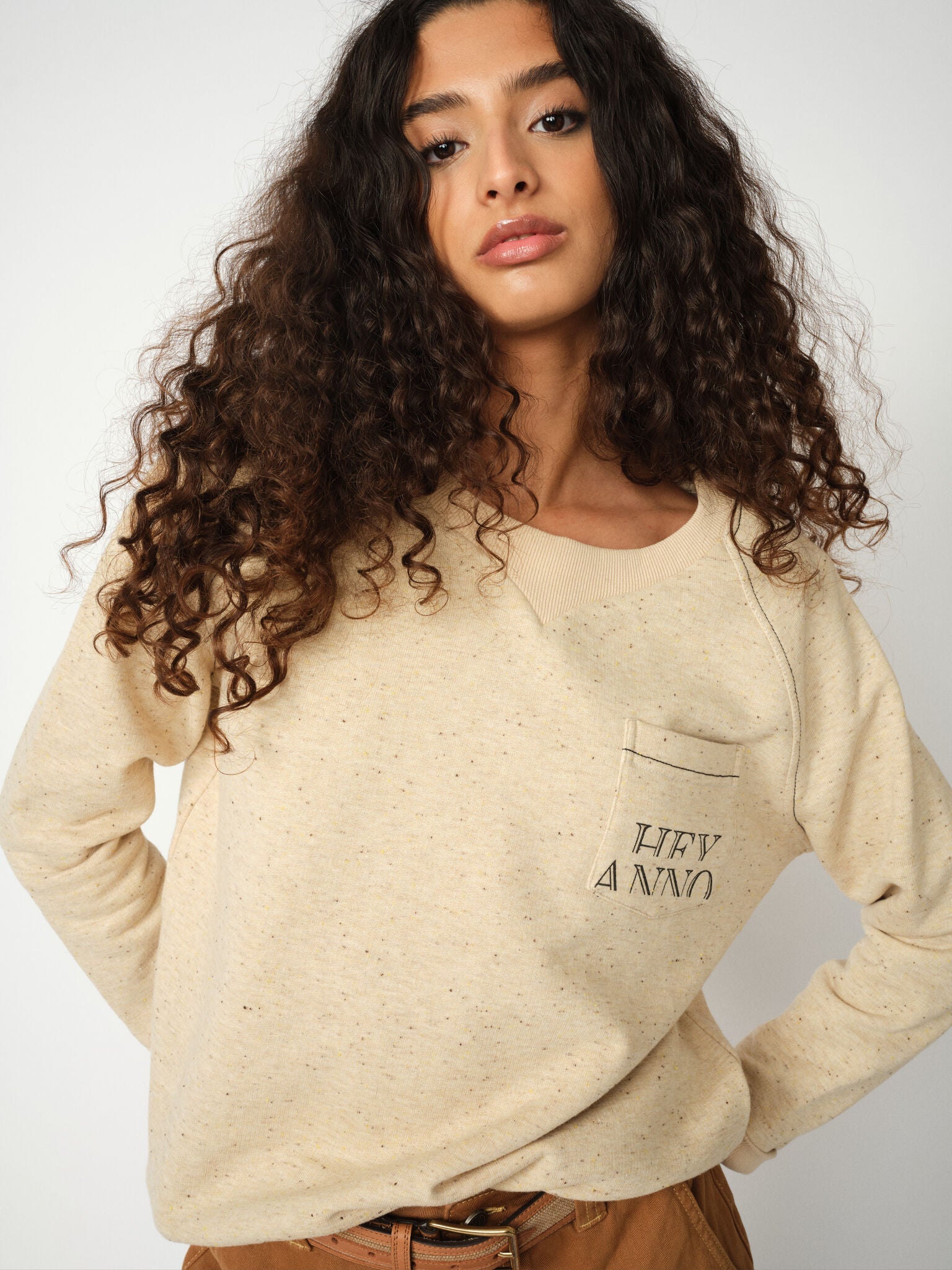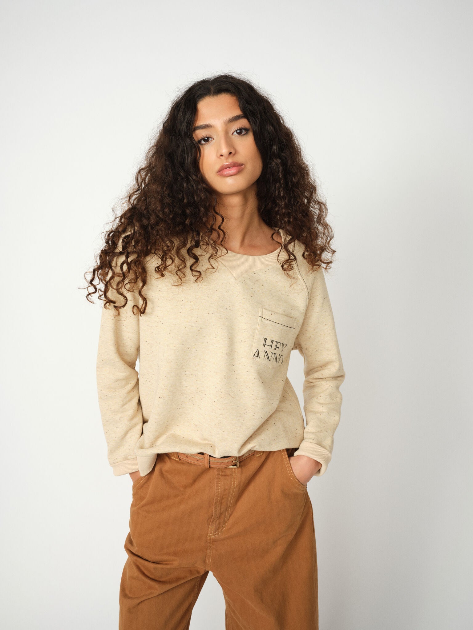 Genser i myk nib-stoff med gult, hvitt og svart vevd inn. Kontraststing på raglan-sømmene og retro ribbdetalj ved halsen. Avsluttet med en subtil logo på lommen for et diskret uttrykk.