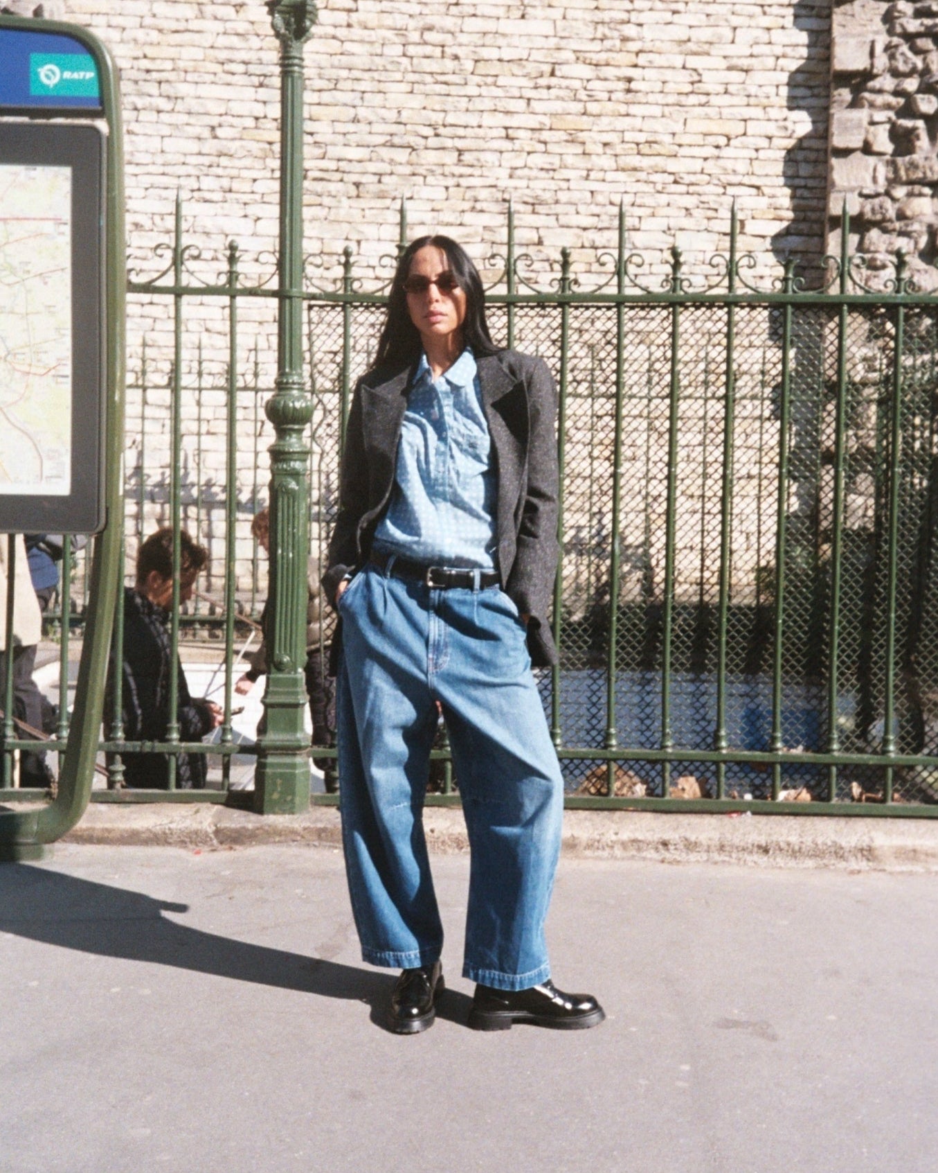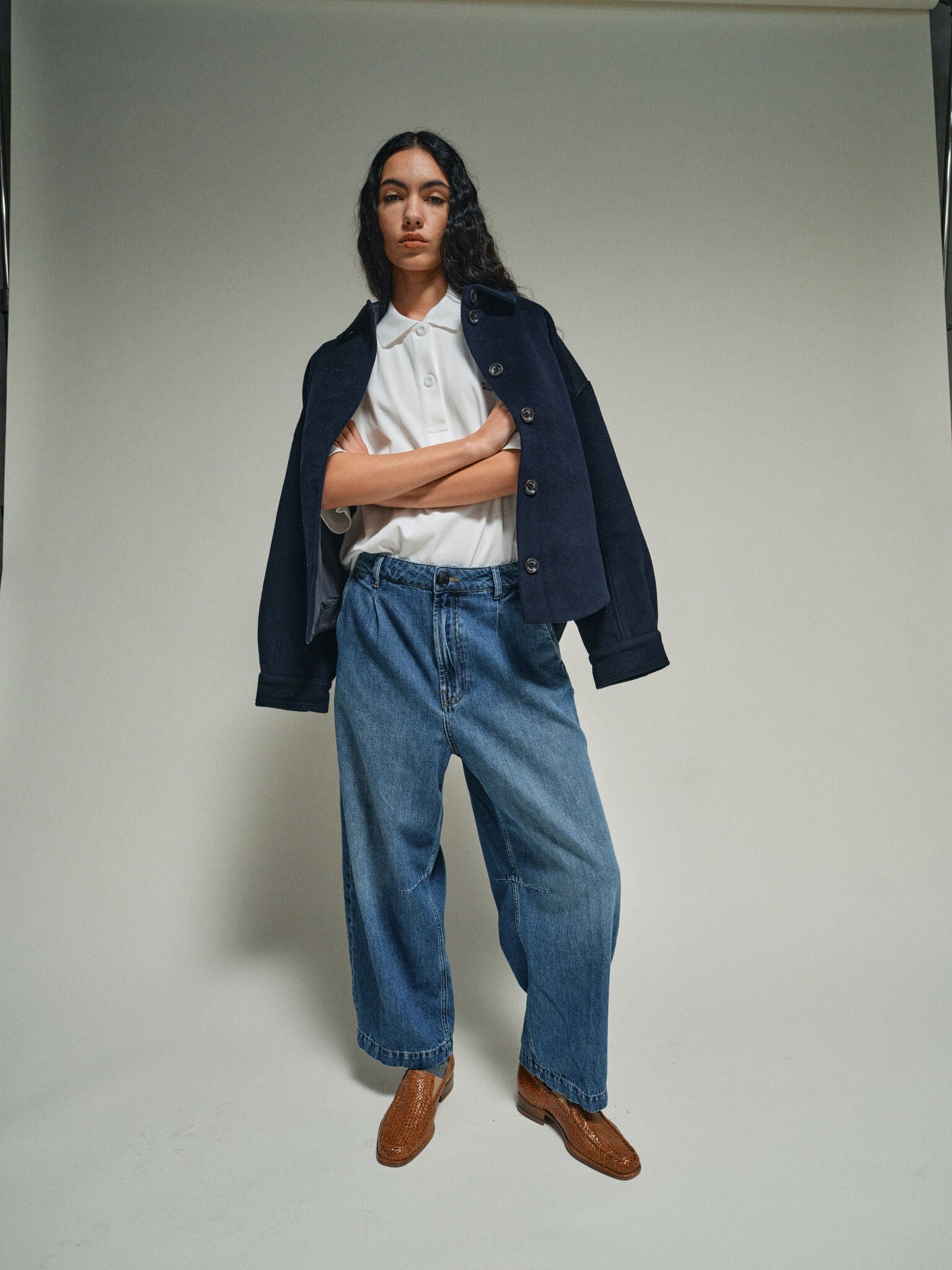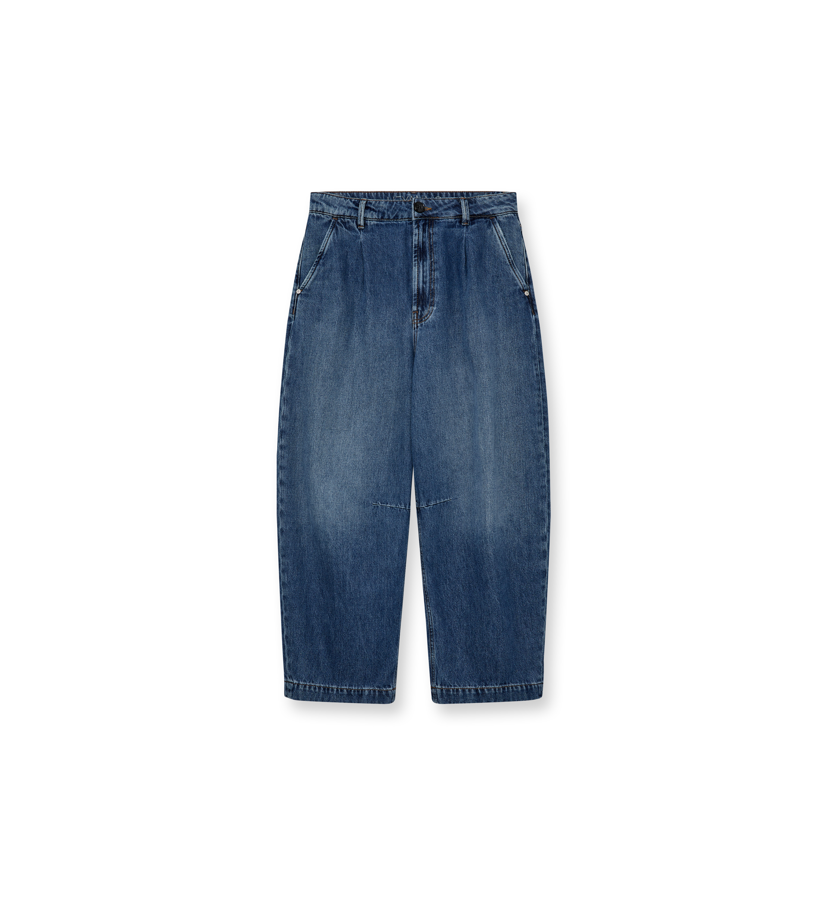 Vide jeans med lav midje og en kul, drapert fasong. Den sydd-på svarte knappen og den mørke undertonen i vasken gir dybde til denne avslappede stilen.