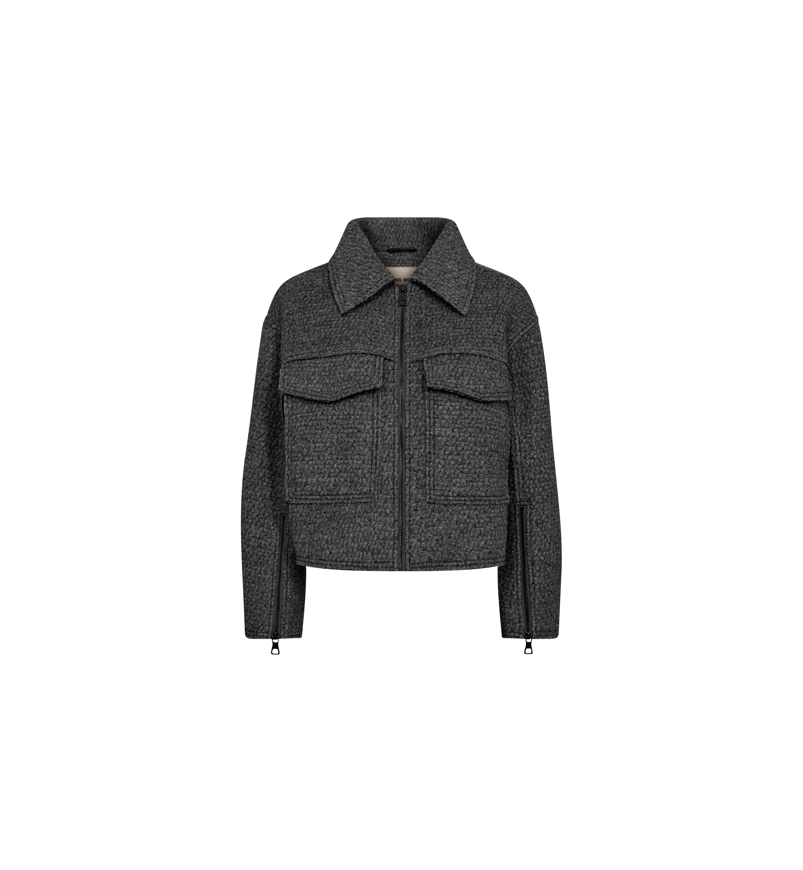 Denne stilige korte jakken gir et moderne preg til en klassisk silhuett med sitt raffinerte melange-mønster og tidløse krage. Den er designet med praktiske frontlommer med klaff og en elegant glidelås, som gjør at den enkelt balanserer stil og funksjonalitet. Glidelåser ved ermene og et signatur MOS MOSH-merke bak gir de siste detaljene, noe som gjør den til et iøynefallende plagg for allsidig styling.