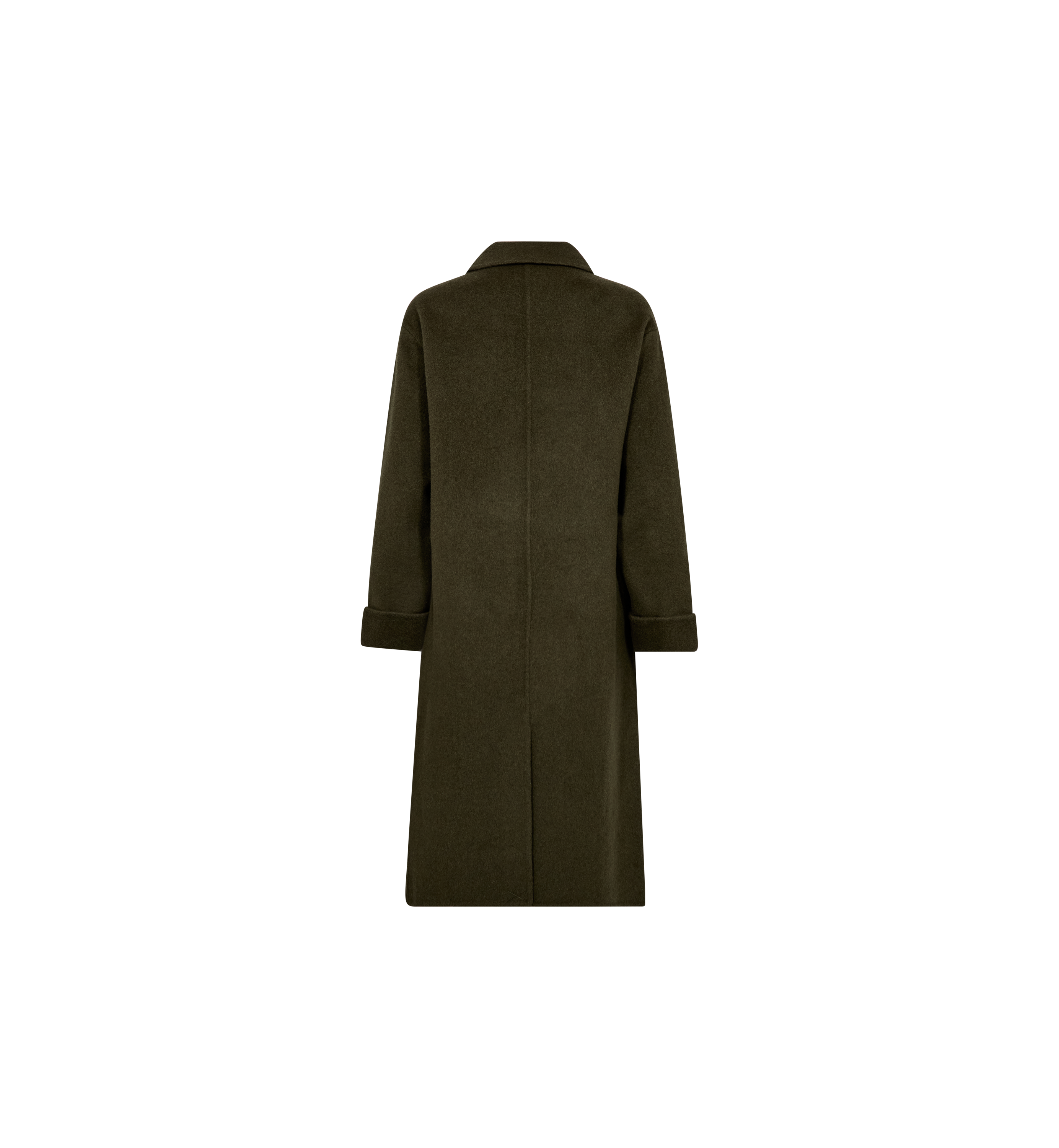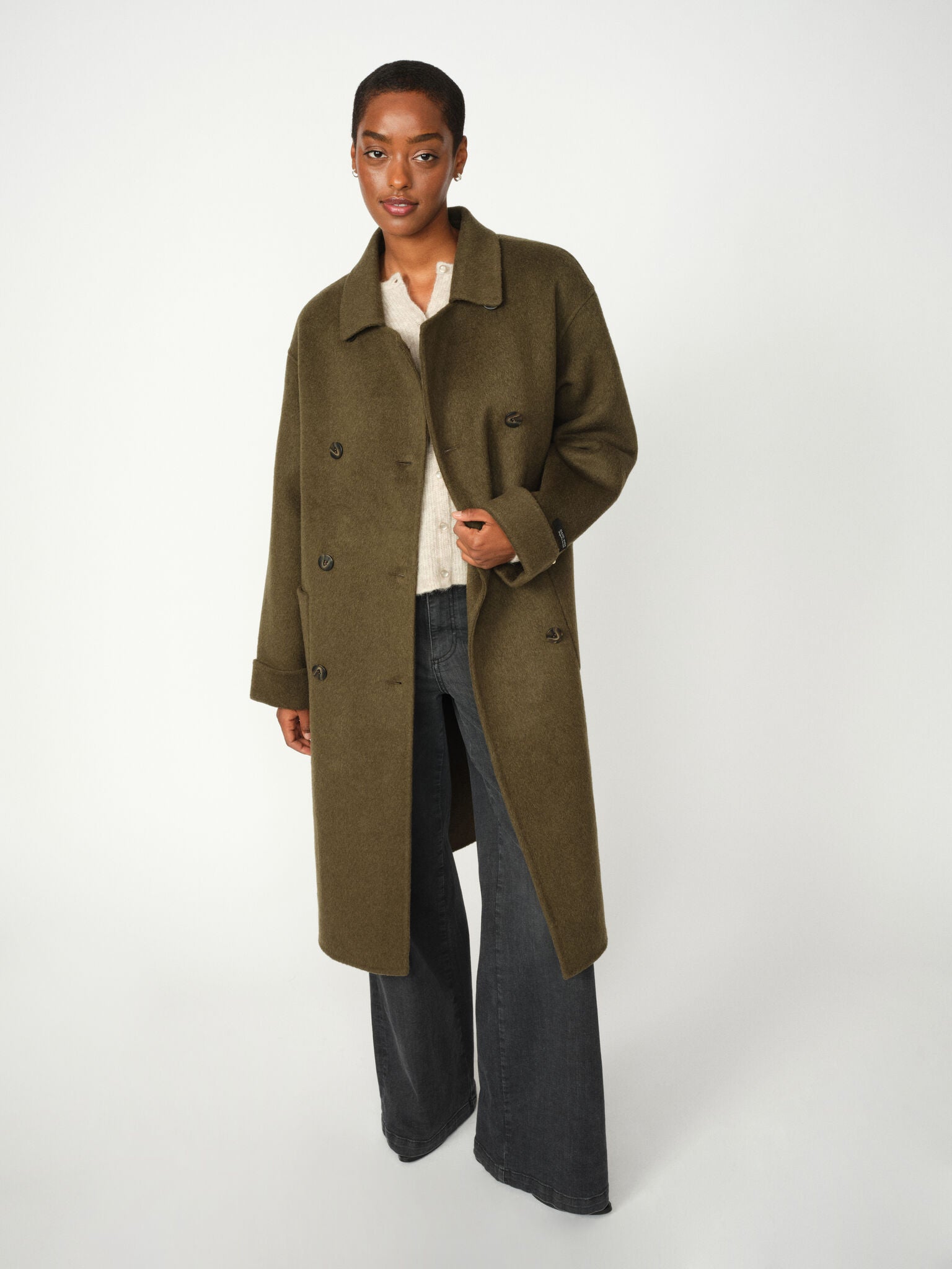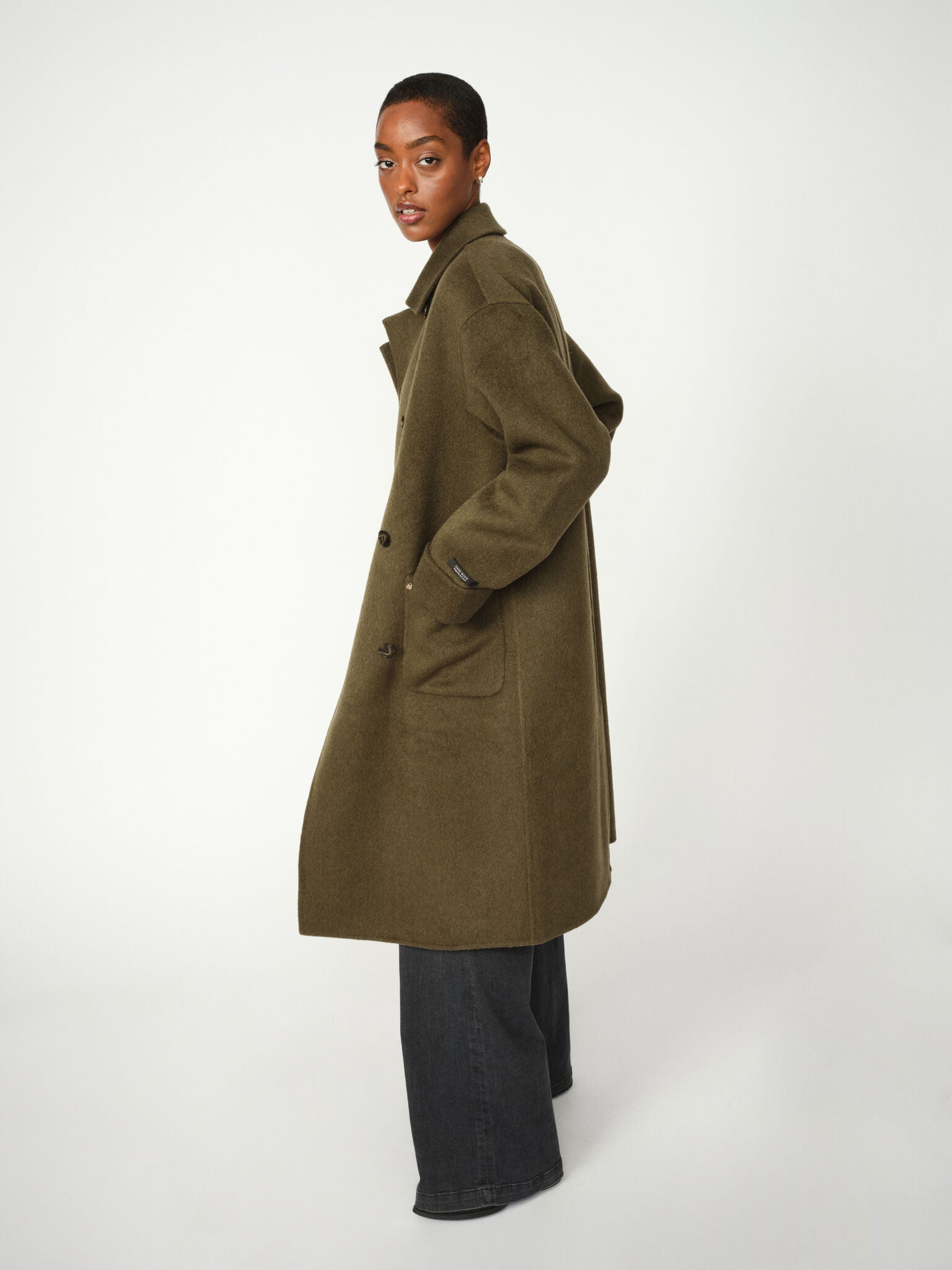 Denne sofistikerte lange ullkåpen viser frem et imponerende mélange-mønster, som gir et raffinert og tidløst uttrykk. Den er designet med et håndlaget preg og uten fôr, der sømmene er nøye ferdigbehandlet for hånd, og sømløst kombinerer to stoffer for en førsteklasses følelse. Kåpen har en klassisk krage og knappelukking, og representerer en perfekt balanse mellom luksuriøst håndverk og uanstrengt eleganse.