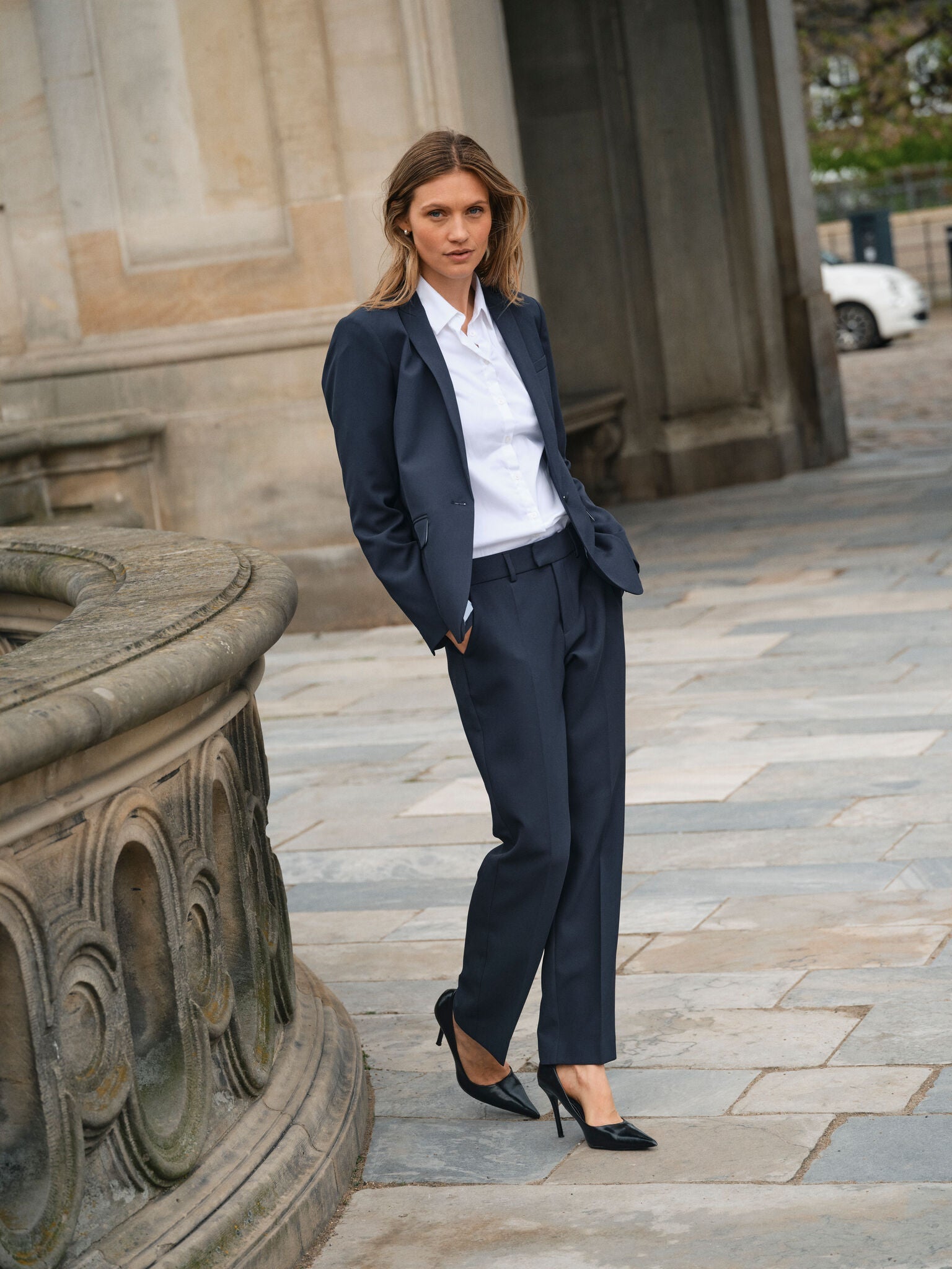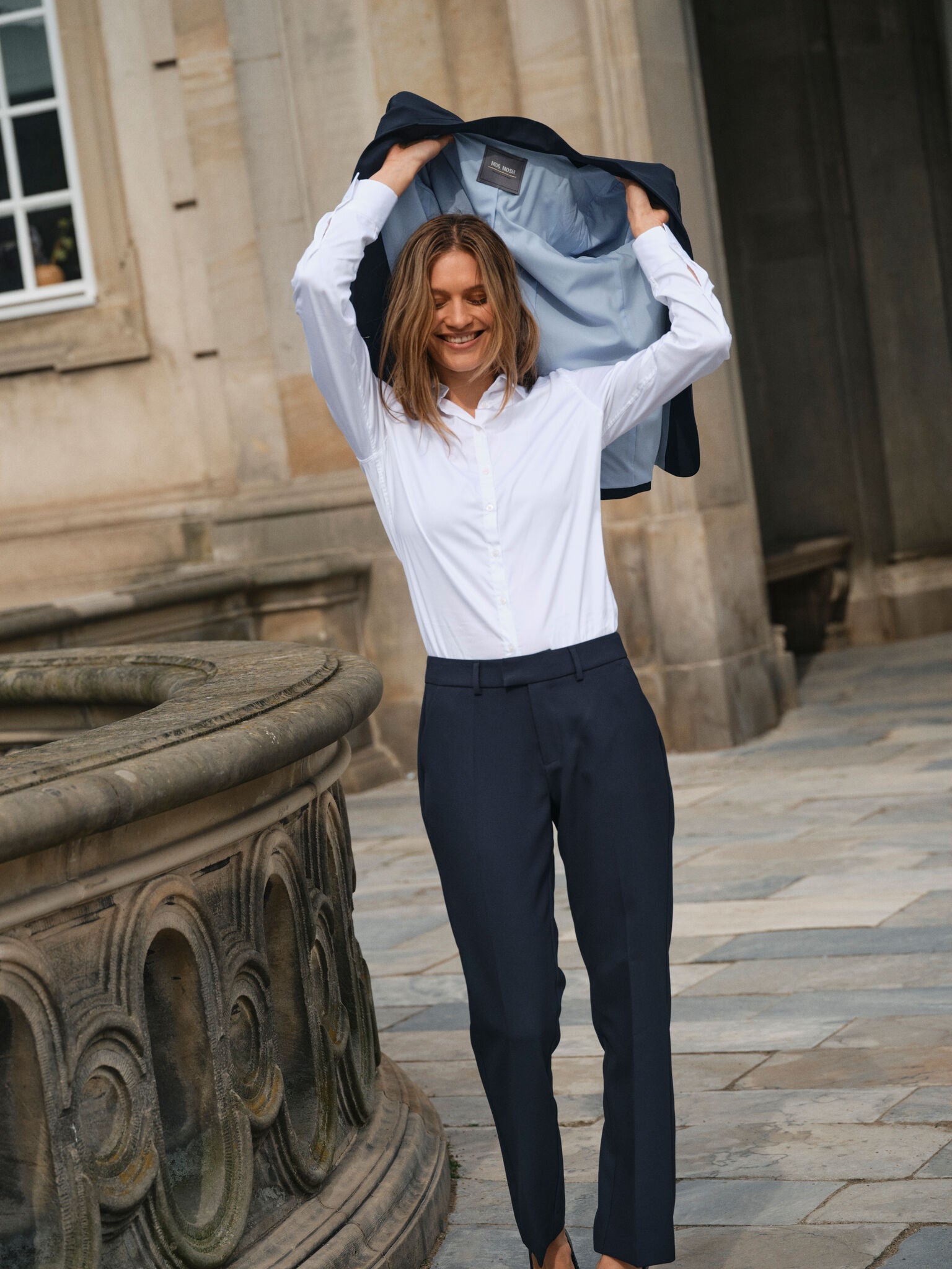 Disse stilrene bukser med middels liv er designet med en smal passform som gir en elegant og strømlinjeformet silhuett. De kombinerer stil og allsidighet, og passer perfekt sammen med chunky strikk eller oversized skjorter for et komfortabelt, men sofistikert antrekk.