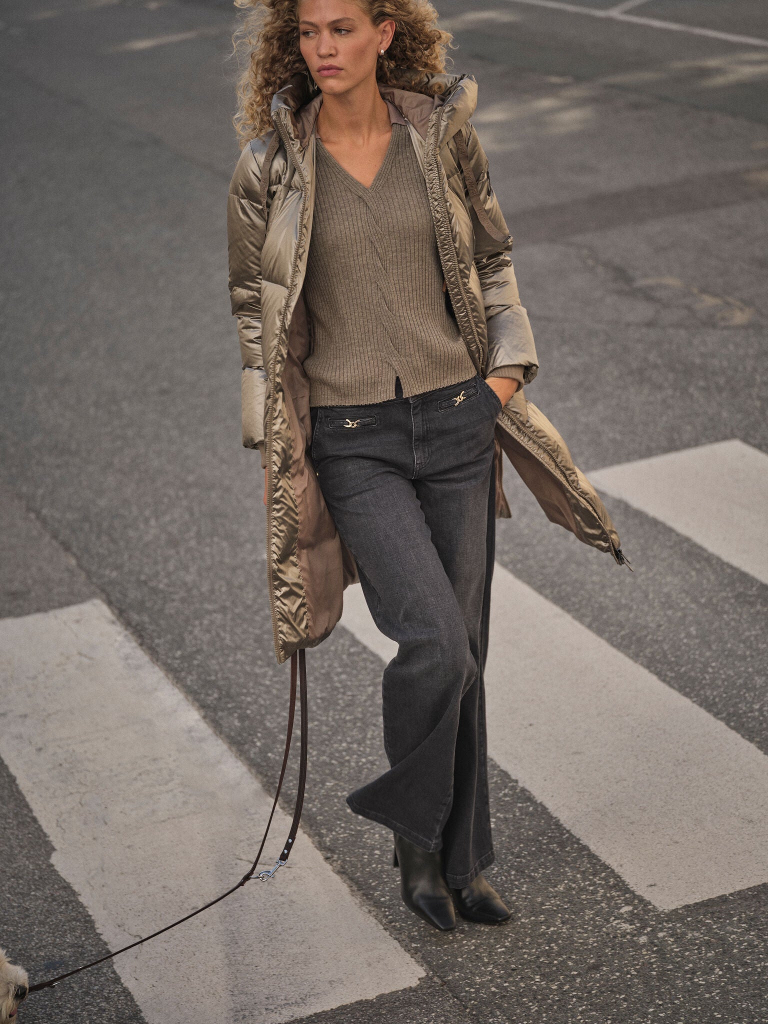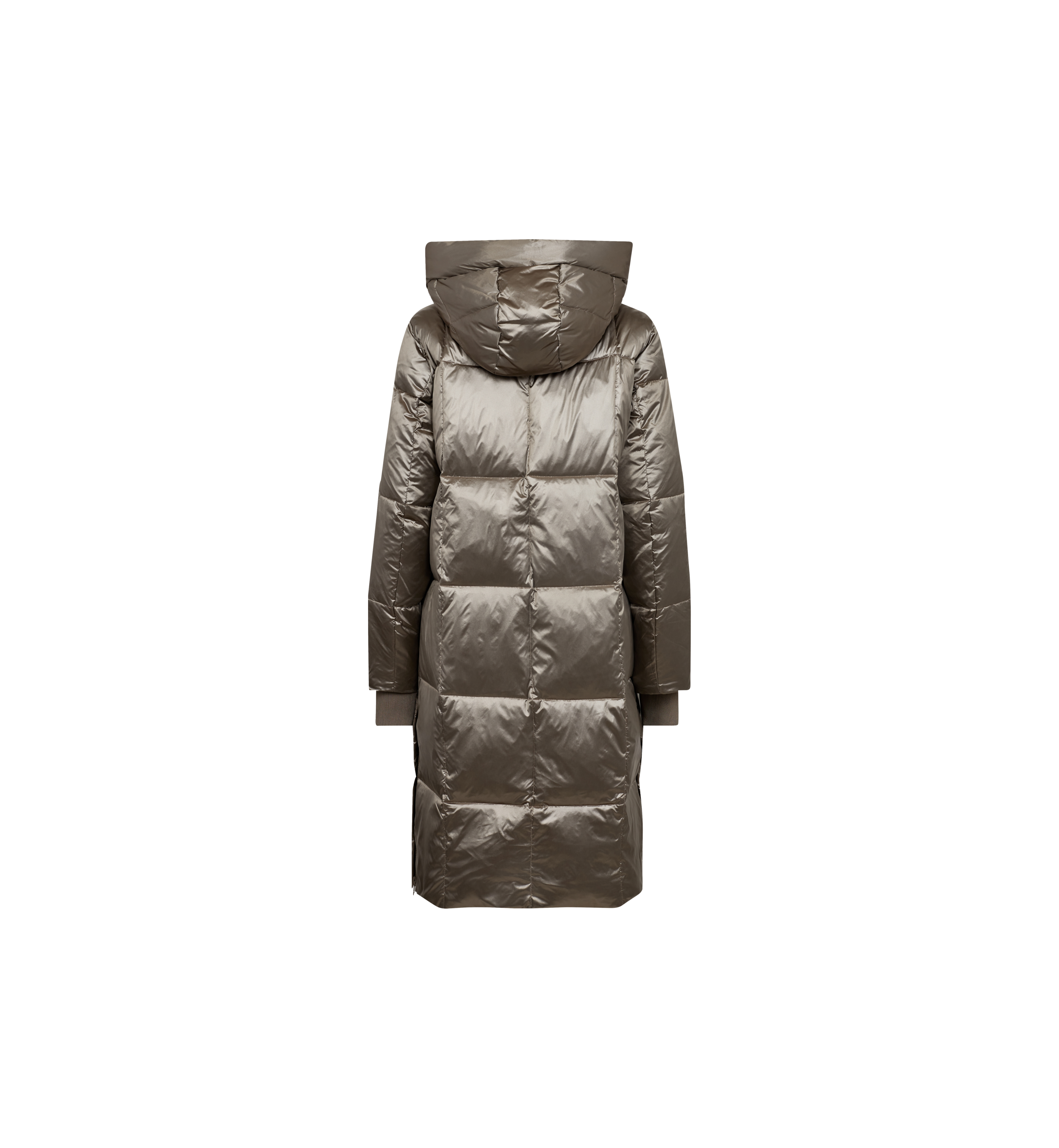 Denne superlette dunjakken holder deg varm i den iskalde kulden. Den er designet i et kjølig metallisk stoff og har en lang passform og en kraftig glidelås. Den er avsluttet med en høy, praktisk krage og sidesplitter, noe som gjør passformen ekstra fleksibel.