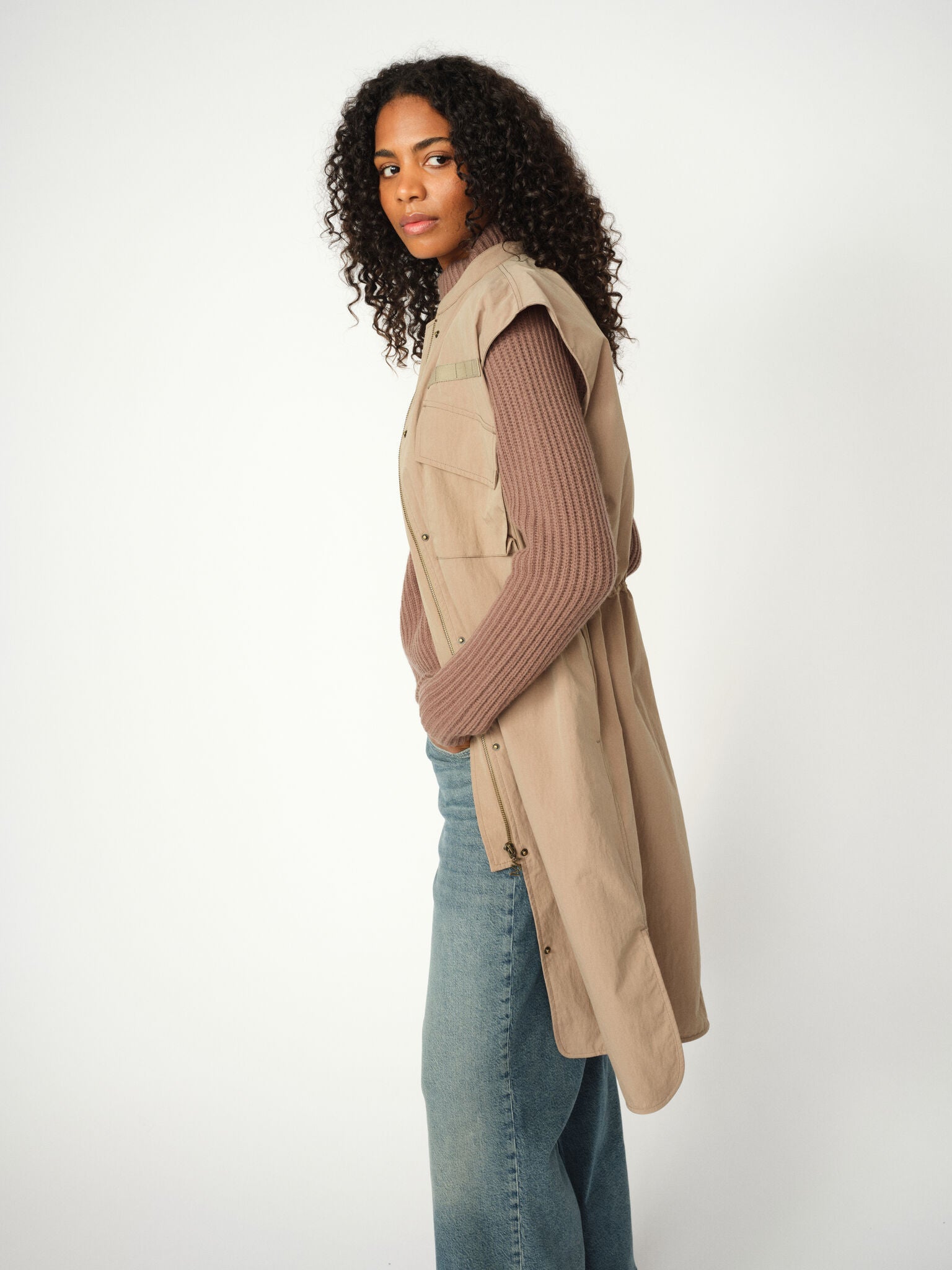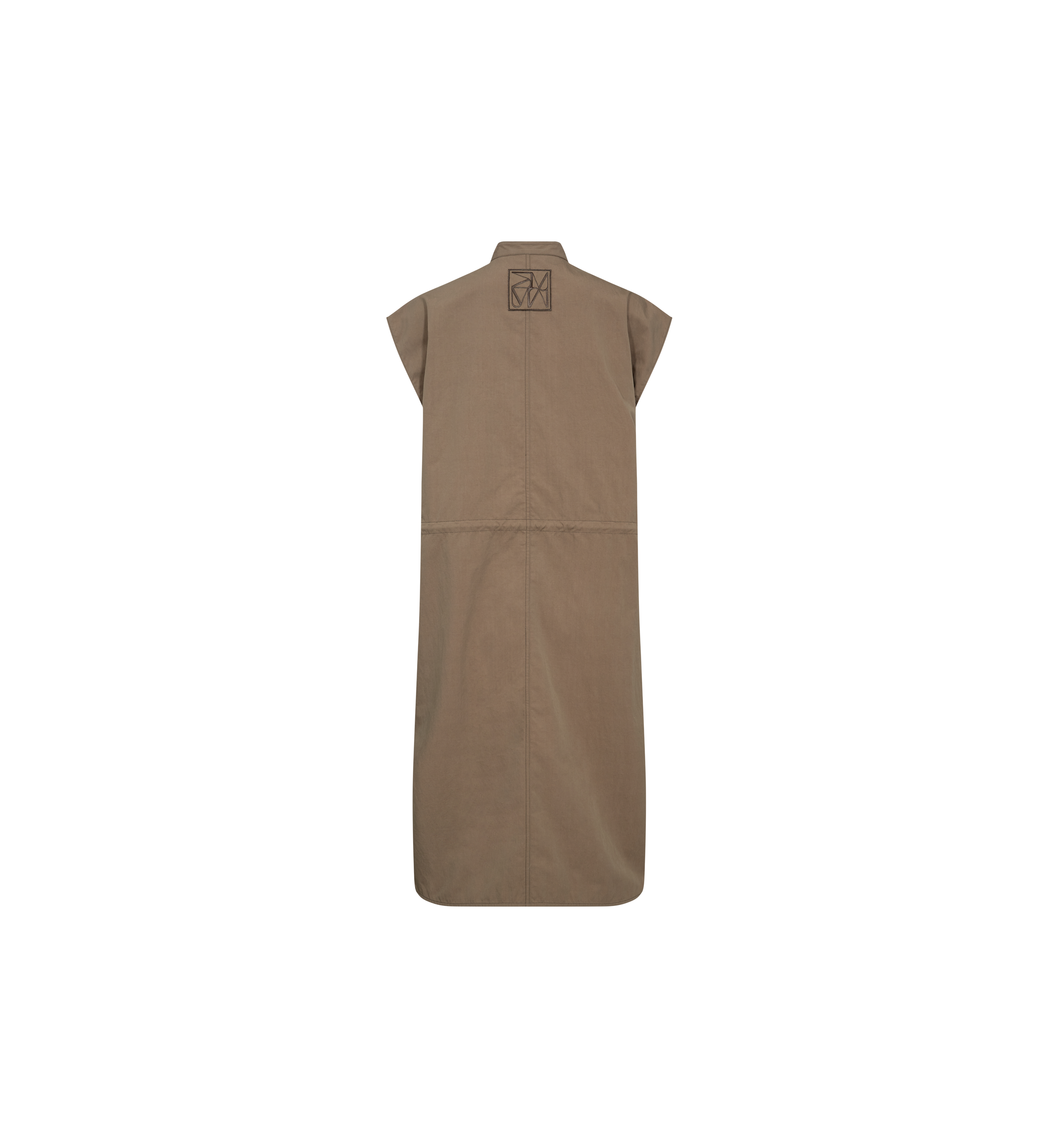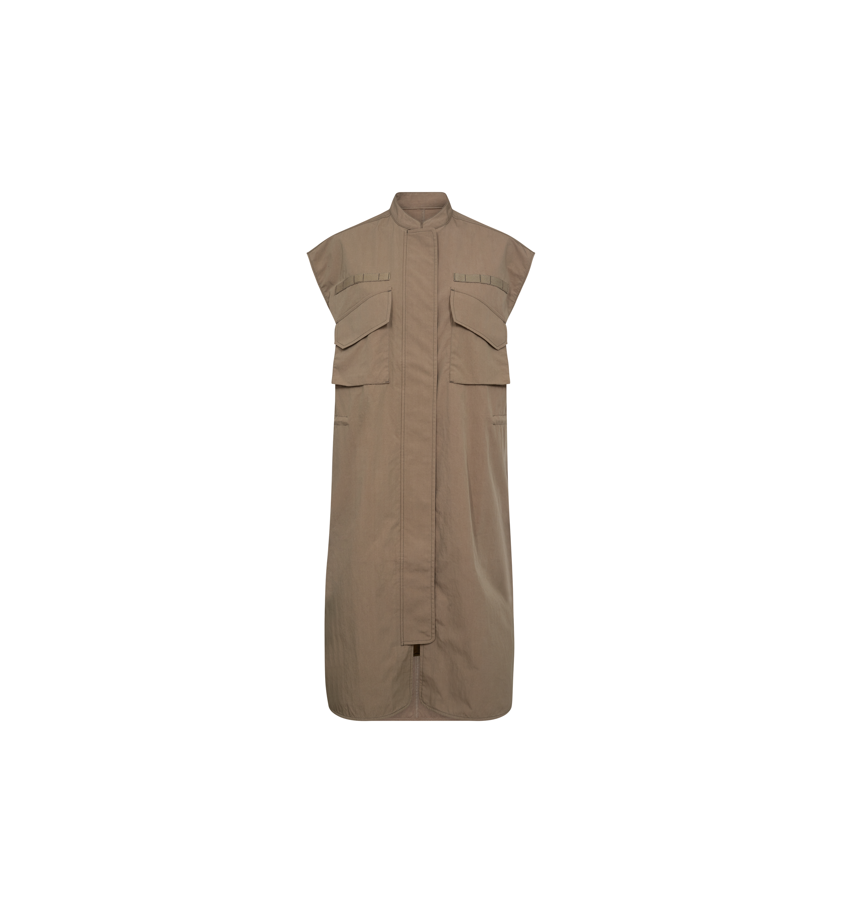 Denne moderne kjolen inspirert av funksjonalitet er designet med en stilren ståkrage og en skjult glidelås foran for et raffinert, strømlinjeformet utseende. Dristige kontrastdetaljer i stoff gir et moderne preg, mens funksjonelle lommer tilfører både praktisk nytte og struktur. En subtil logo på baksiden fullfører designet, noe som gjør dette til et statement-plagg for enkle, selvsikre stylinger.