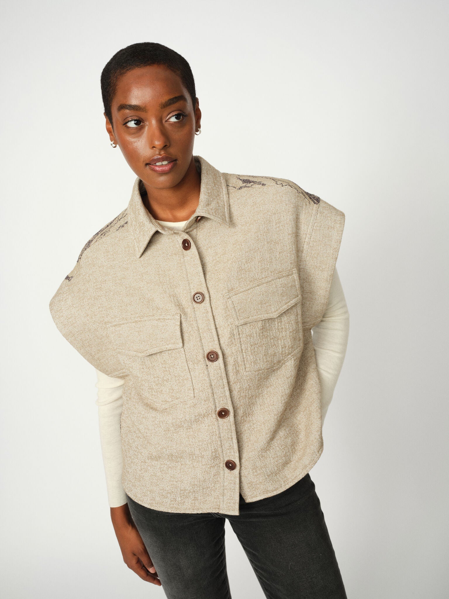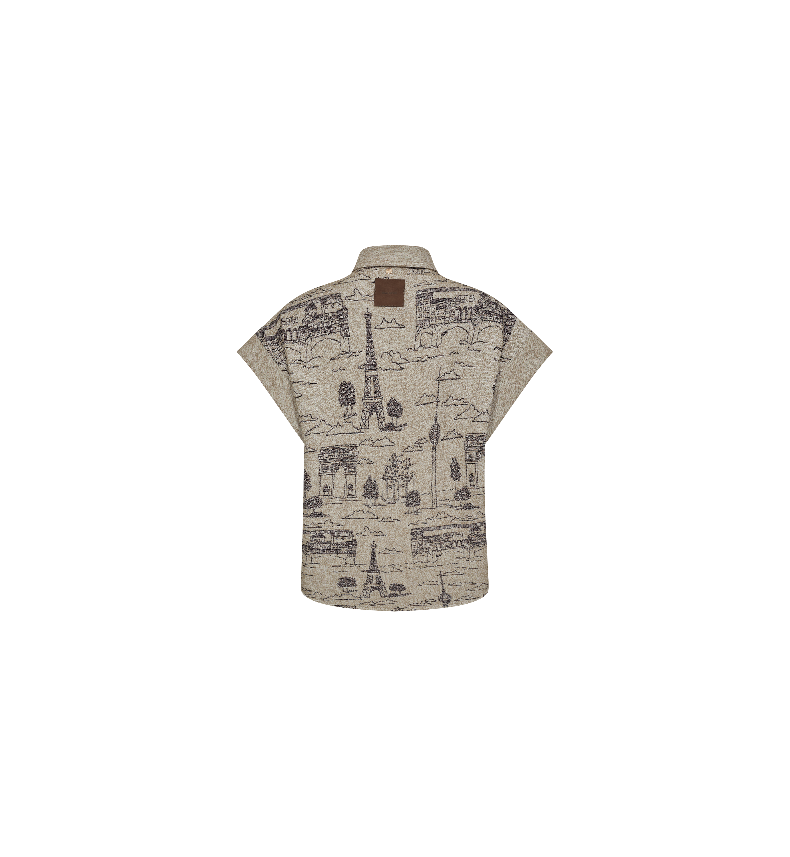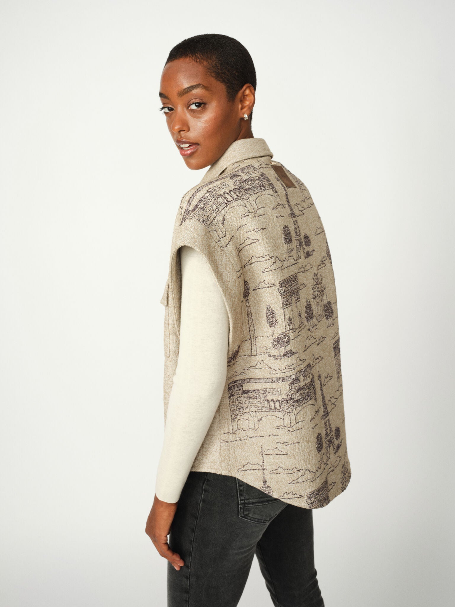 Denne sofistikerte vesten har en klassisk krage, knappelukking og stilige klaffelommer, som kombinerer tidløs skreddersøm med en moderne vri. Et unikt håndtegnet trykk på ryggen fremhever ikoniske byattraksjoner, noe som gir den et kunstnerisk og iøynefallende preg. Med et signaturmerke på baksiden er denne allsidige delen perfekt for å ha over en crisp skjorte eller en myk genser, og gir et raffinert, men moderne utseende.