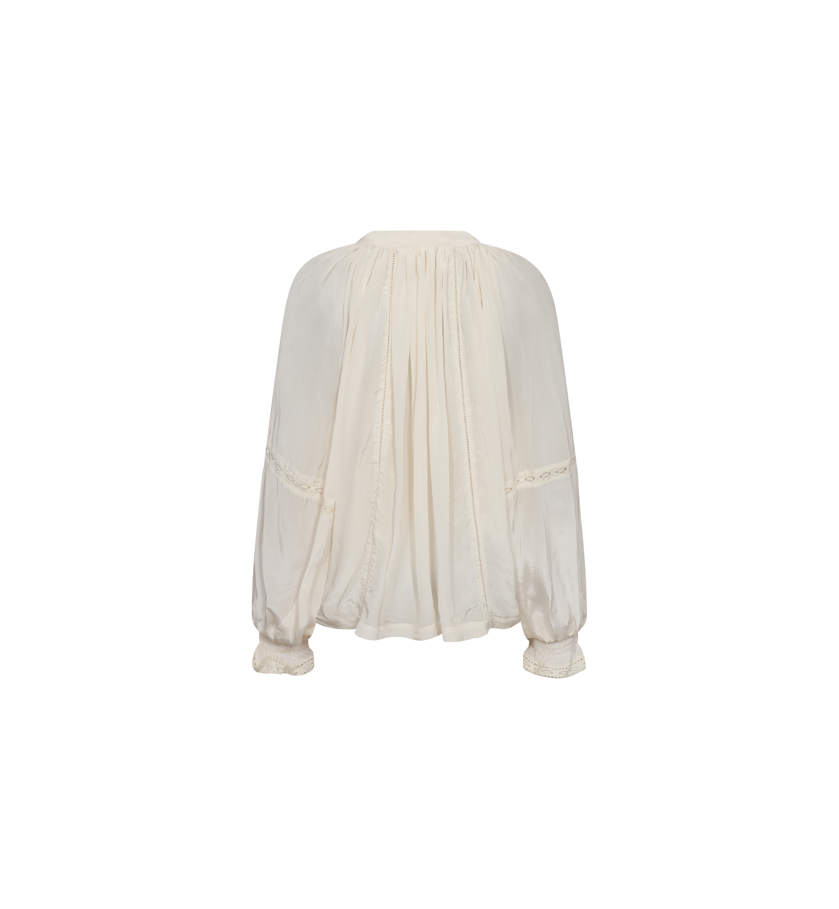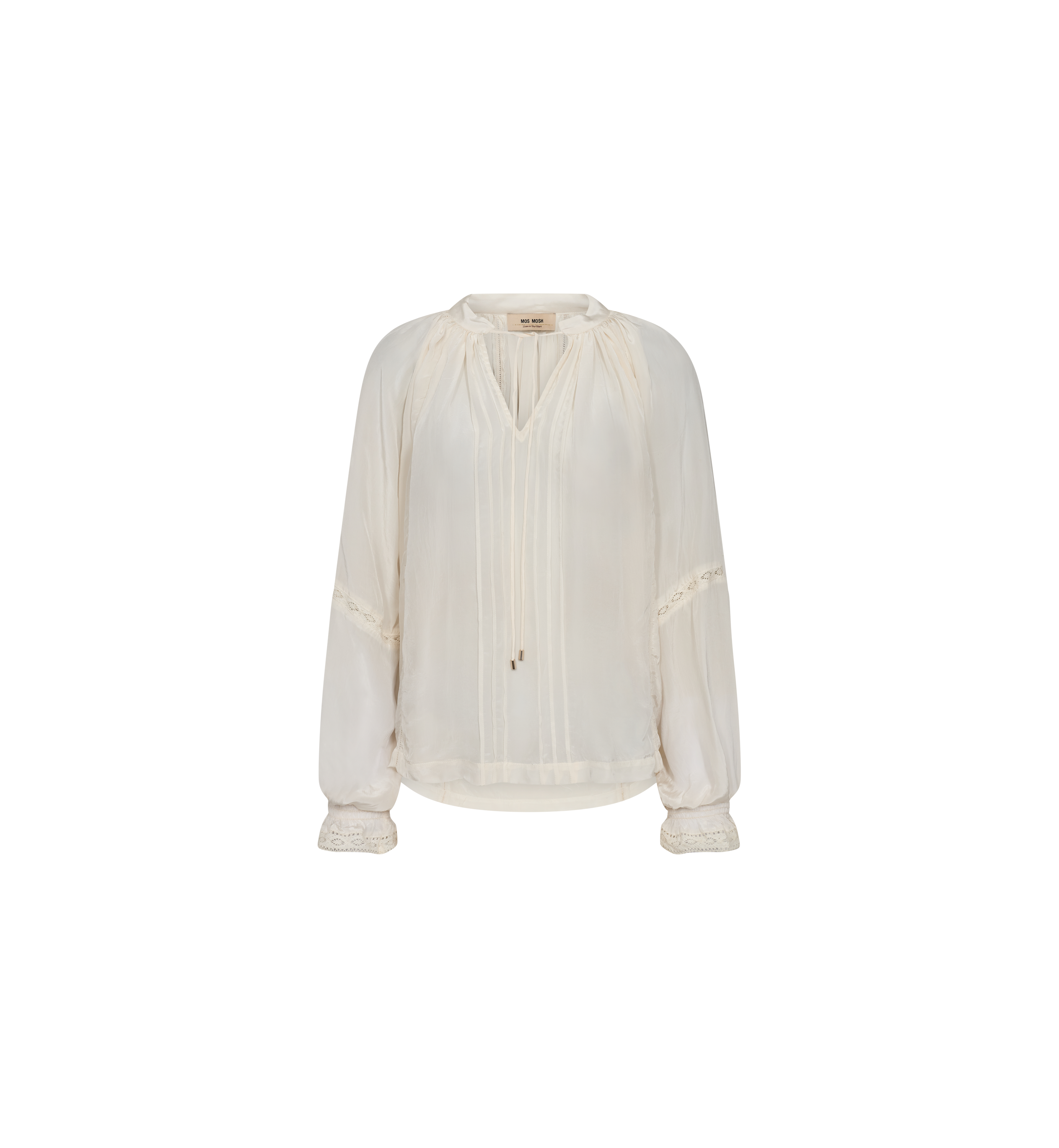 Denne uanstrengt elegante blusen er designet med en avslappet passform, og har en flatterende V-hals med justerbar snøring for en tilpassbar silhuett. Den myke plisseeffekten og de smockede mansjettene gir et raffinert preg, som fremhever flyten i det glatte stoffet. Enten den kombineres med skreddersydde bukser for et polert utseende, eller med denim for en avslappet-chic stil, er denne blusen et allsidig garderobeessens.
