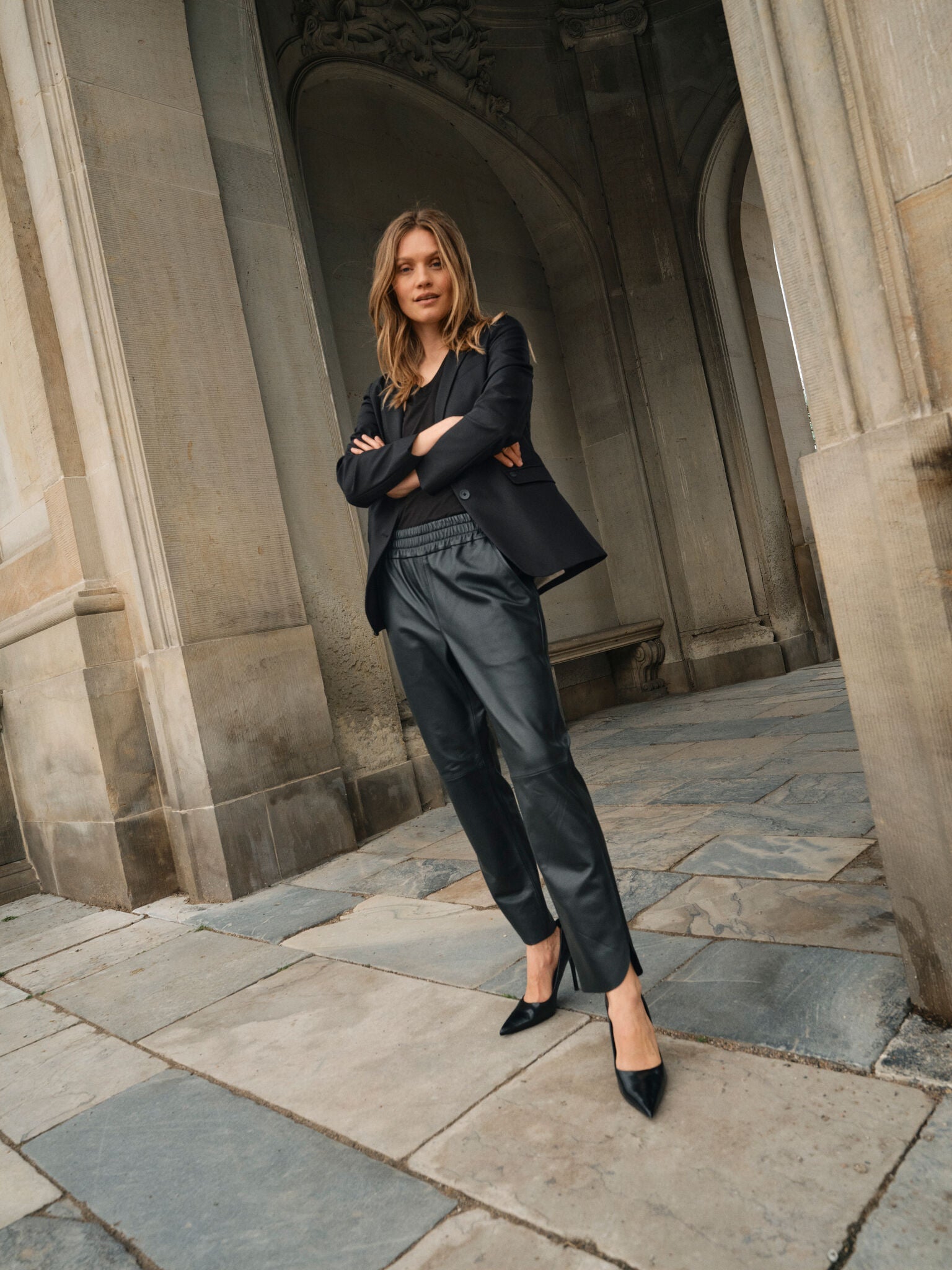 Er du på jakt etter komfortable, men samtidig eksklusive skinnbukser? Da kan disse skinn-sweatpants være noe for deg. De er designet med en løs passform, middels livhøyde og lommer, og har en buet splitt nederst ved ankelen. Bruk dem til alt fra klassiske skjorter til lette bluser og statement t-shirts.