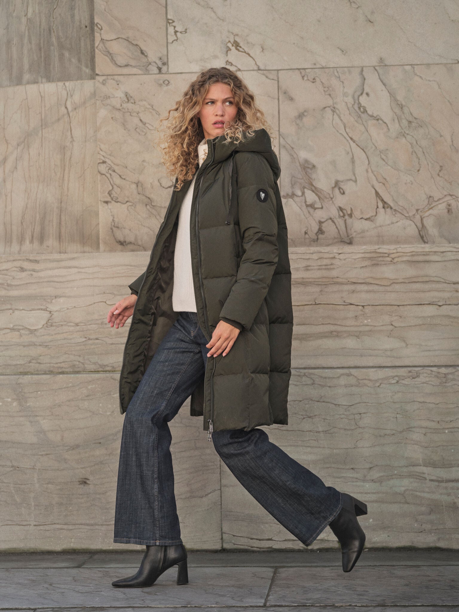 Hold kulden ute med vår elskede Nova-frakk. Denne sesongen har den blitt oppgradert med rutete paneler i myk dun. Men ikke bekymre deg, den høye kragen med snøring og hette holder deg fortsatt varm. Den sterke glidelåsen kan åpnes nedenfra, noe som gir deg mer fleksibilitet på farten. En annen kul detalj er glidelåsene i siden, som er flotte for de som sykler til jobb. Frakken føles lett takket være den ansvarlig produserte dunen. Bruk den til alt!